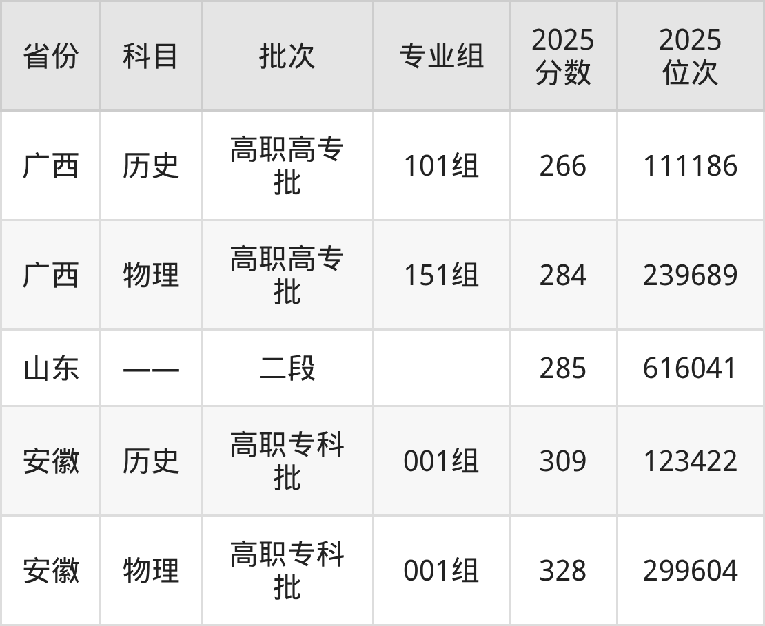 山东服装职业学院2025招生录取分数线已公布,2025年山东服装职业学院在山东省专科投档录取最低分285分。在广西壮族自治区专科物理类投档录取最低分284分,更多省份具体录取分数线详见下文。