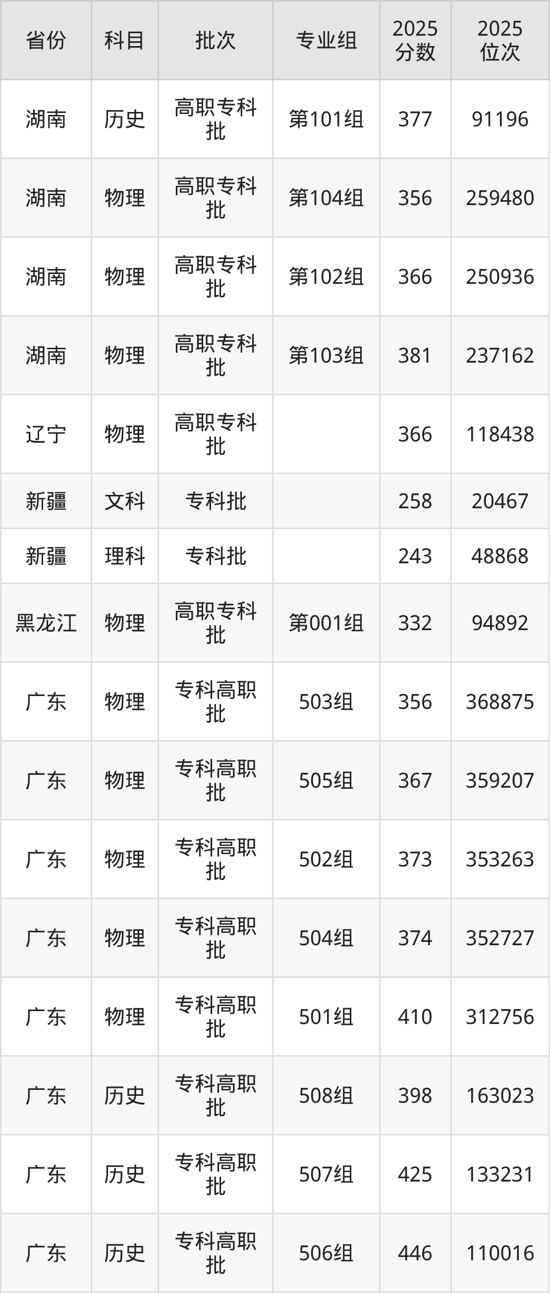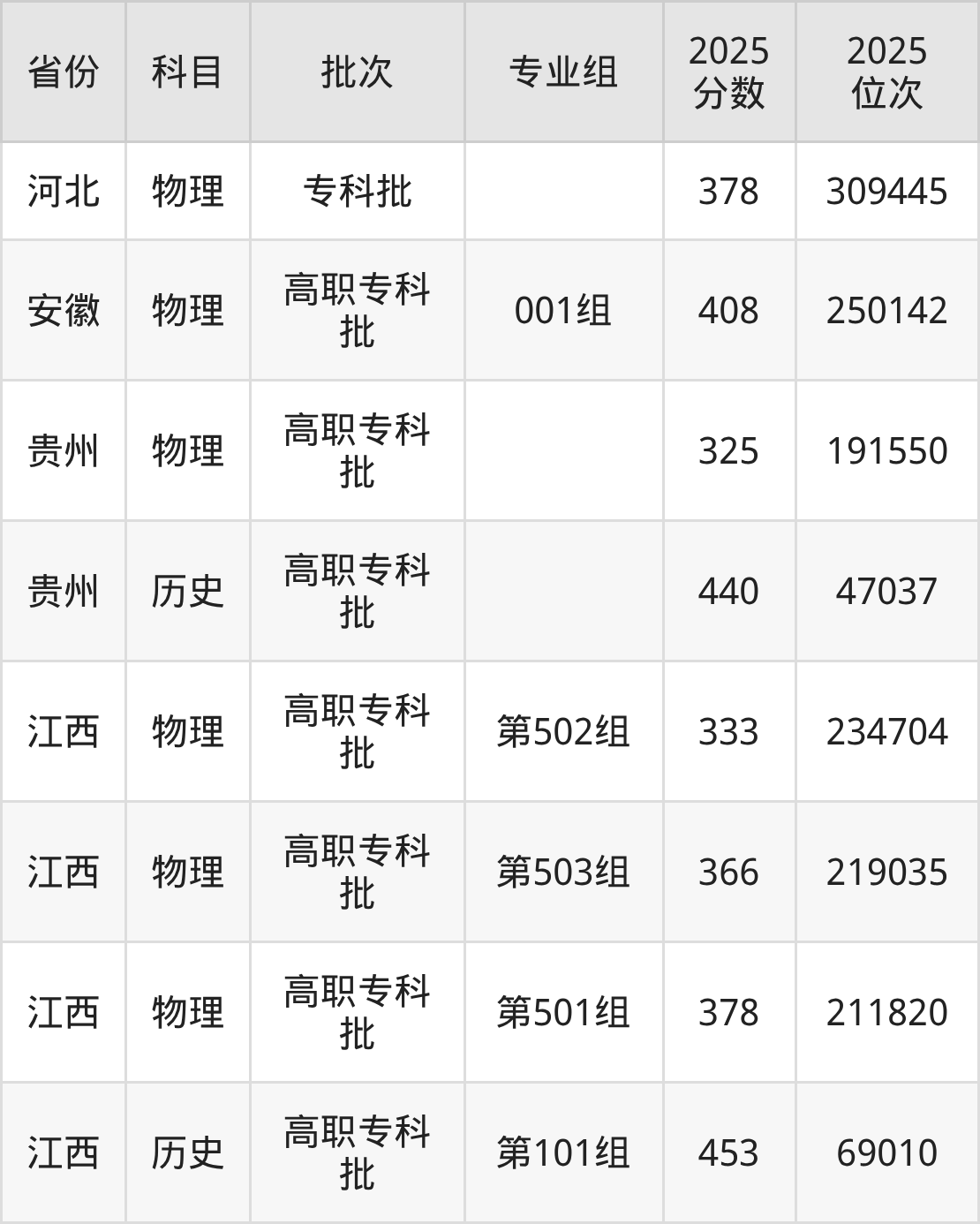 2025年在专科物理类进行招生,各专业组分数线详情如下: