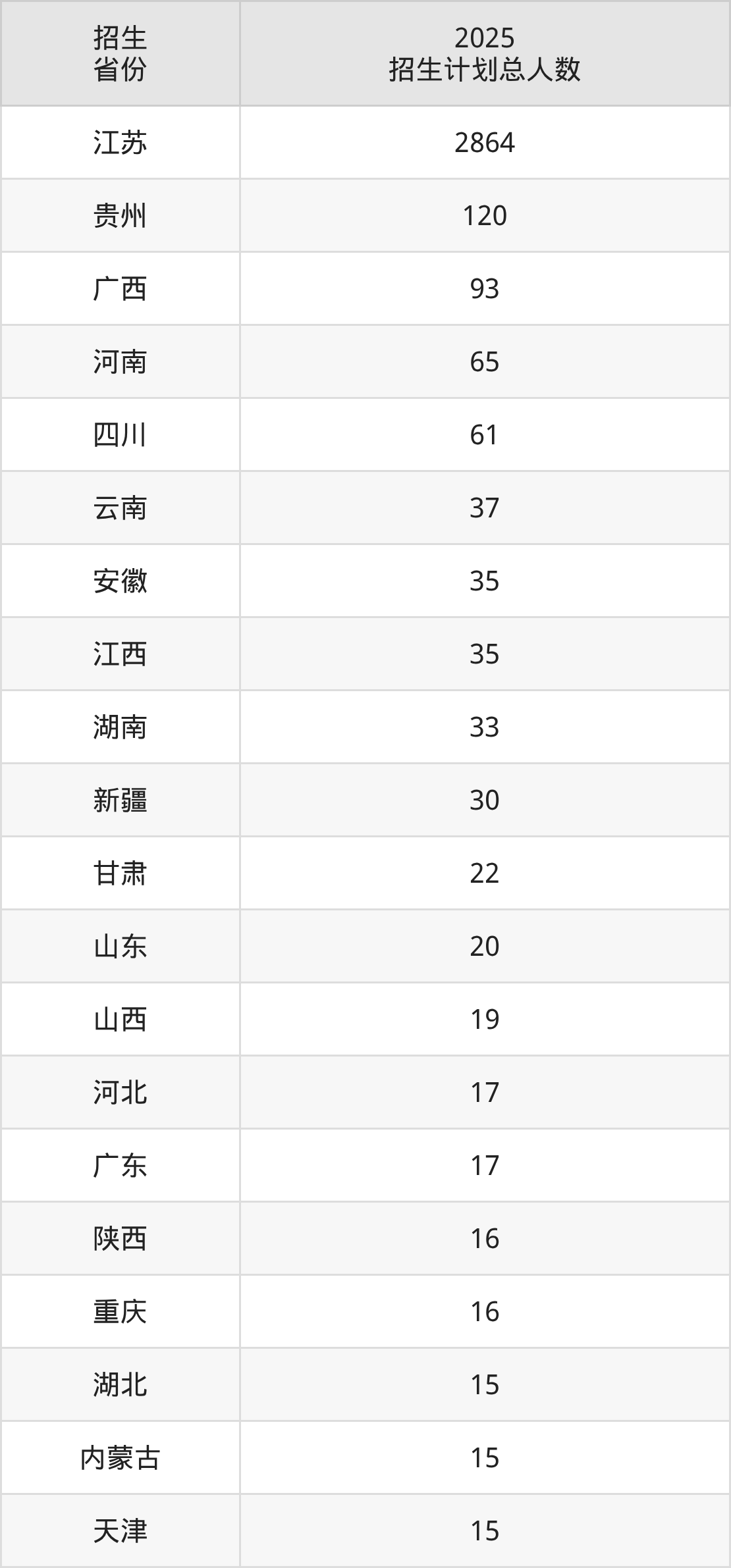 2025年金陵科技学院面向全国29个省市开展本科招生;招生专业共60个,招生人数共3636人。2025年在江苏省招生计划总人数是2864人,其中,金陵科技学院在江苏省招生人数最多的是软件工程。金陵科技学院在各省具体招生人数情况如下表。