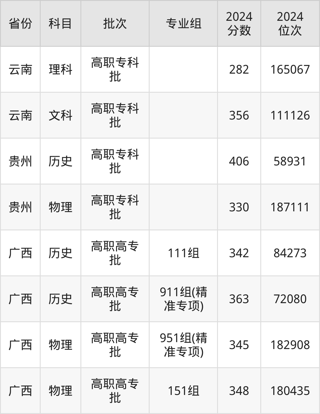 广西工商职业技术学院911专业组(精准专项):2024年投档录取最低分为363分,录取最低位次为72080名。