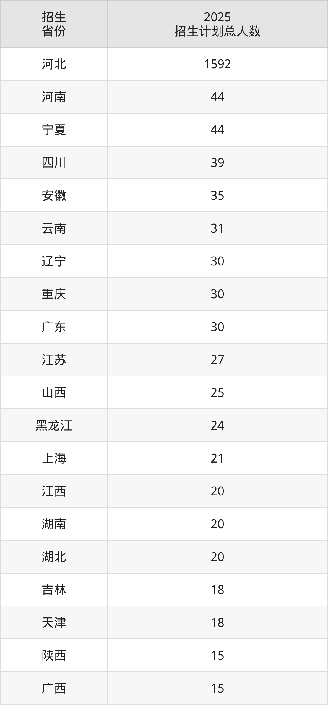2025年河北环境工程学院面向全国24个省市开展本科招生;招生专业共21个,招生人数共2138人。2025年在河北省招生计划总人数是1592人,其中,河北环境工程学院在河北省招生人数最多的是物联网工程。河北环境工程学院在各省具体招生人数情况如下表。