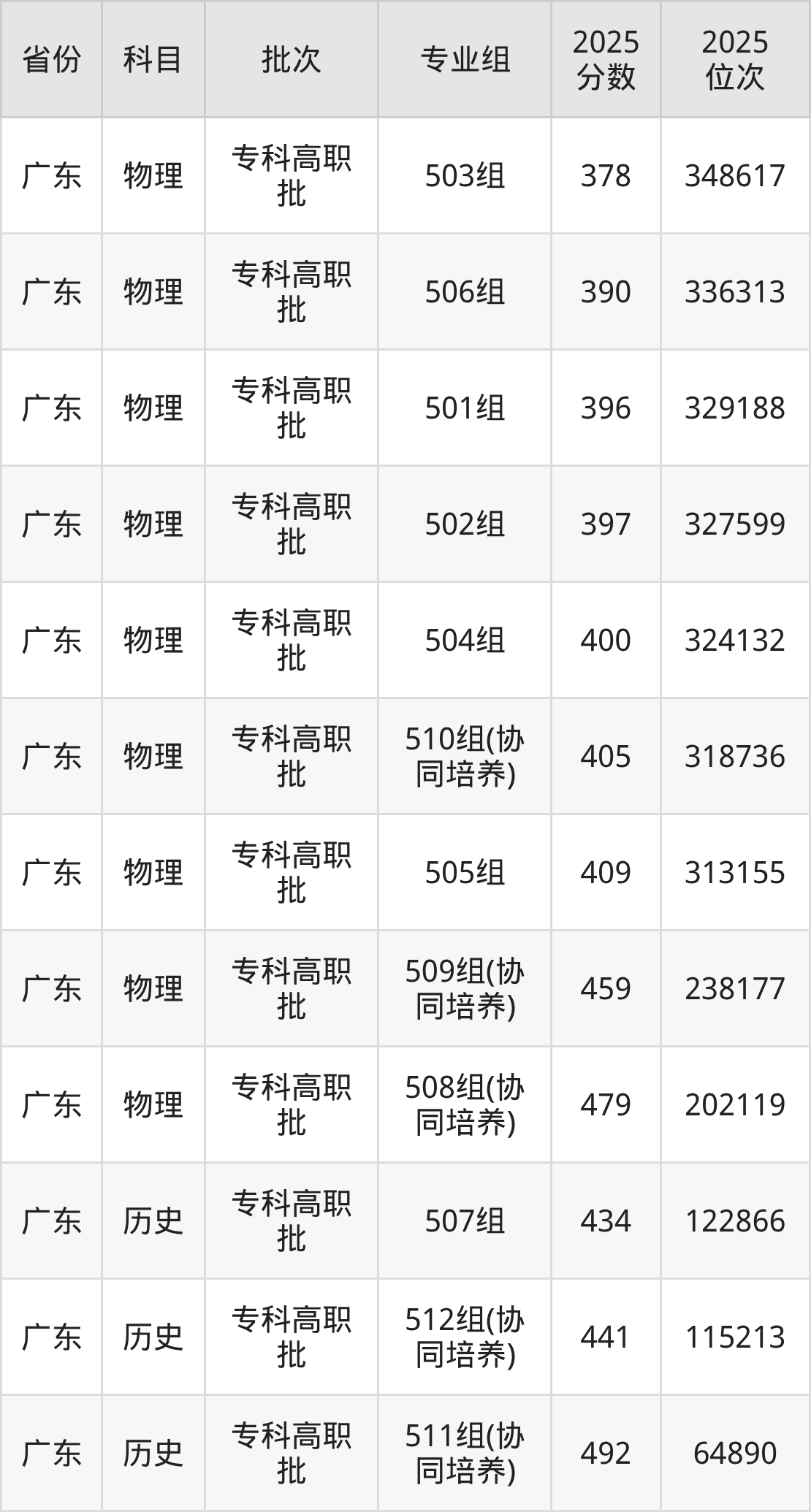 广东邮电职业技术学院503组:2025年投档录取最低分为378分,录取最低位次为348617名。