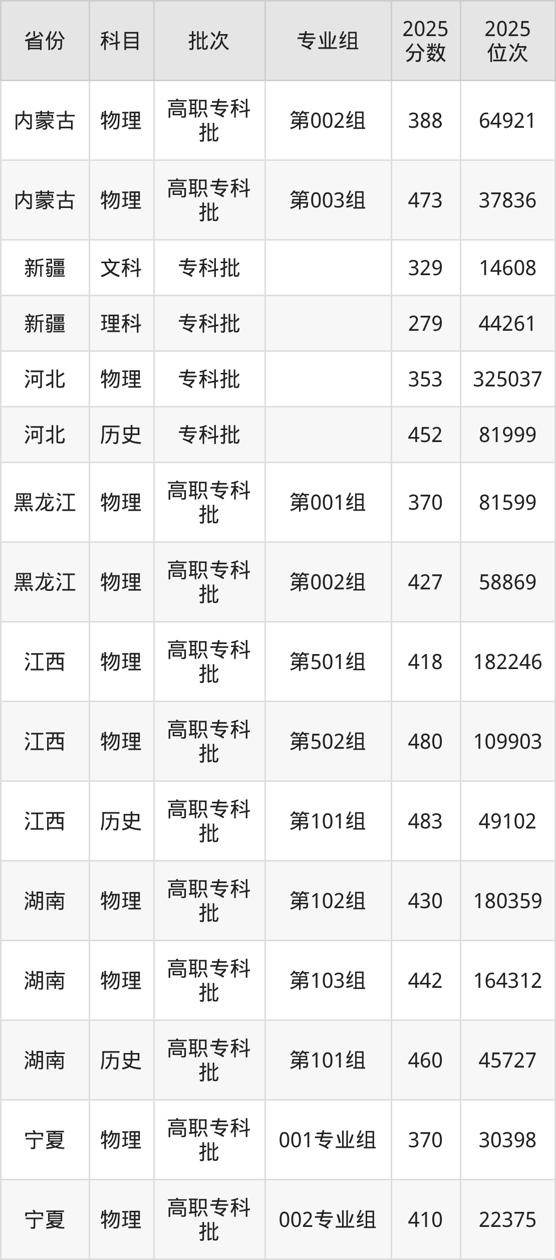 2025年在专科物理类进行招生,各专业组分数线详情如下: