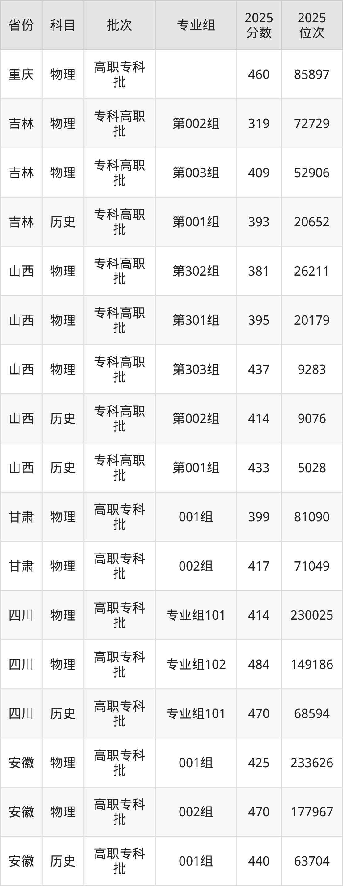 普通类专科物理类最低381分,专科历史类最低414分
