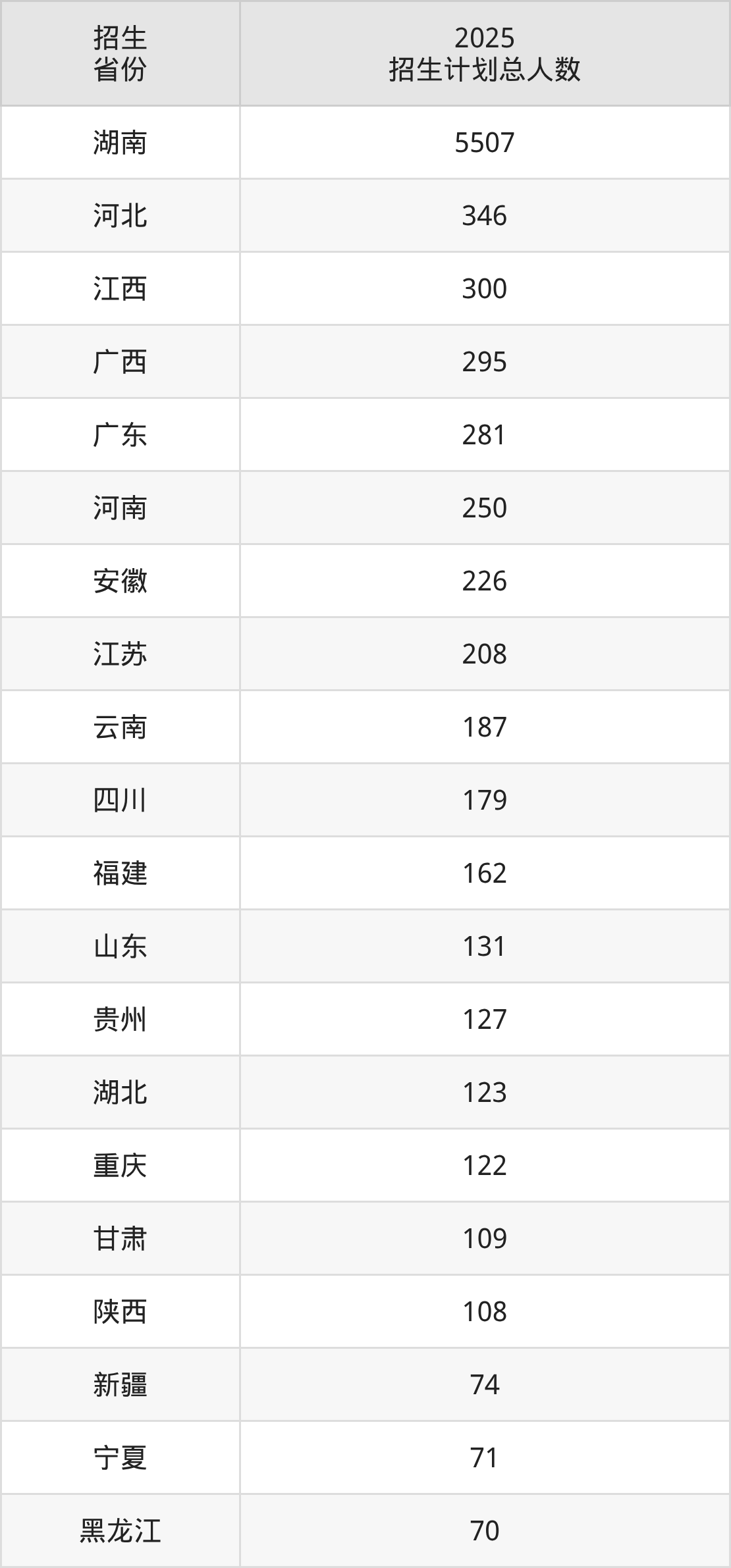 2025年湖南工业大学面向全国29个省市开展本科招生;招生专业共66个,招生人数共9167人。2025年在湖南省招生计划总人数是5507人,其中,湖南工业大学在湖南省招生人数最多的是机械设计制造及其自动化。湖南工业大学在各省具体招生人数情况如下表。