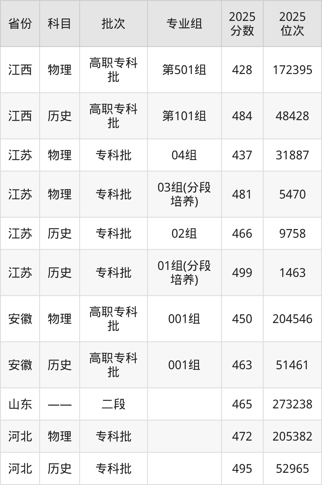 2025年苏州经贸职业技术学院全国录取分数线是428分到499分,录取最低在江西物理类(第501组)、录取最高在江苏历史类(01组(分段培养))。各省各专业组最低分具有差异,详情如下: