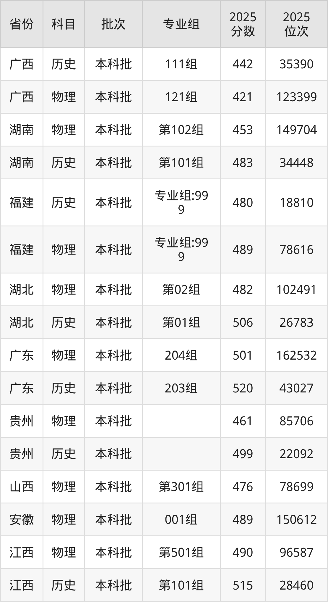 2025年在本科物理类进行招生,各专业组分数线详情如下: