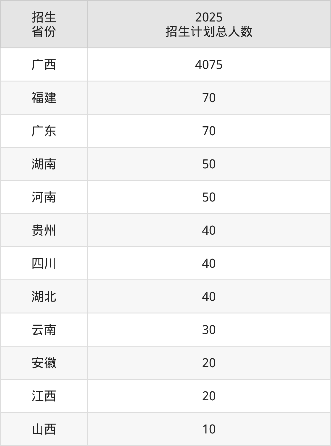 2025年广西农业职业技术大学面向全国12个省市开展本科招生;招生专业共35个,招生人数共2815人。2025年在广西壮族自治区招生计划总人数是4075人,其中,广西农业职业技术大学在广西壮族自治区招生人数最多的是动物医学。广西农业职业技术大学在各省具体招生人数情况如下表。