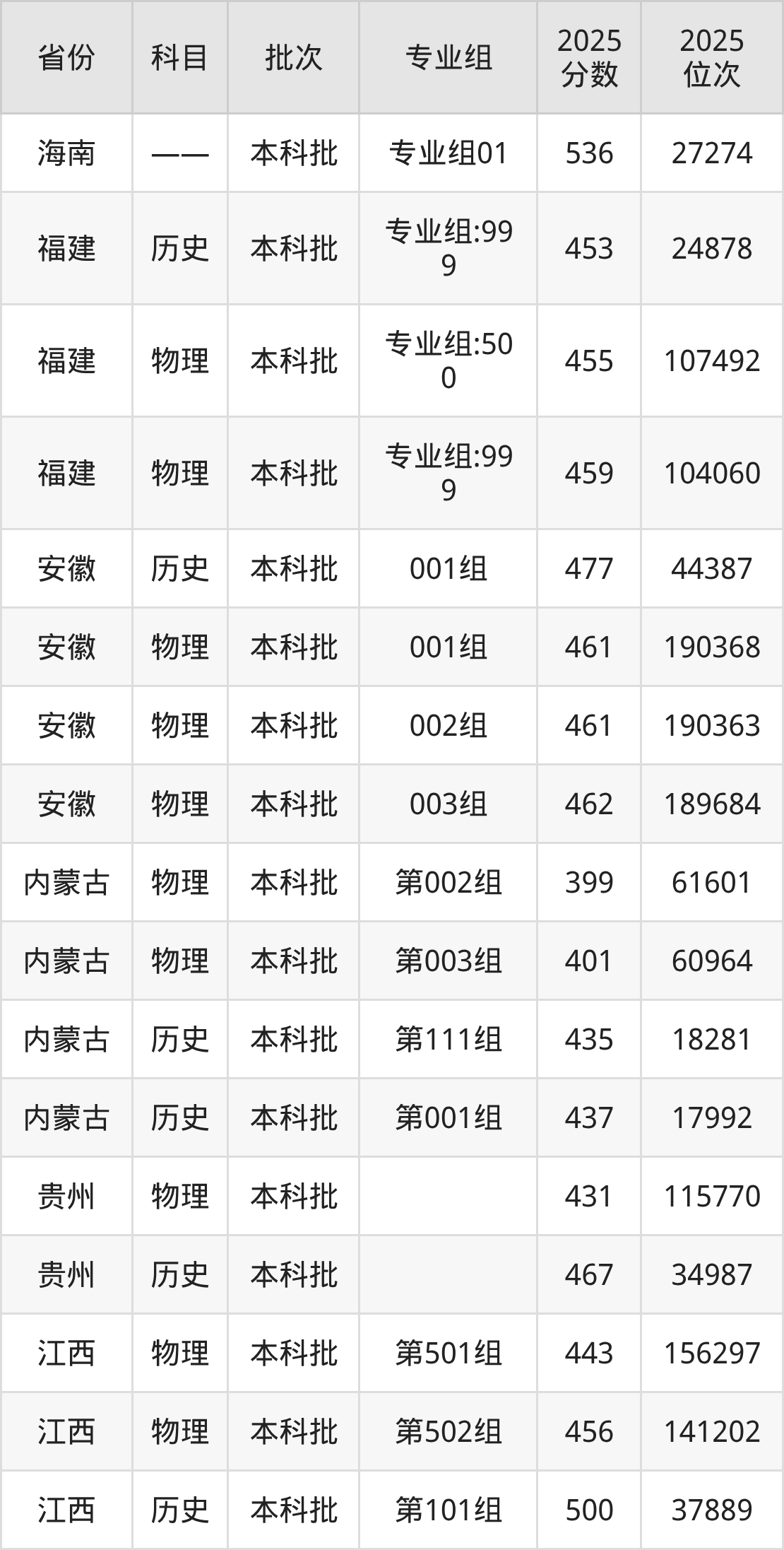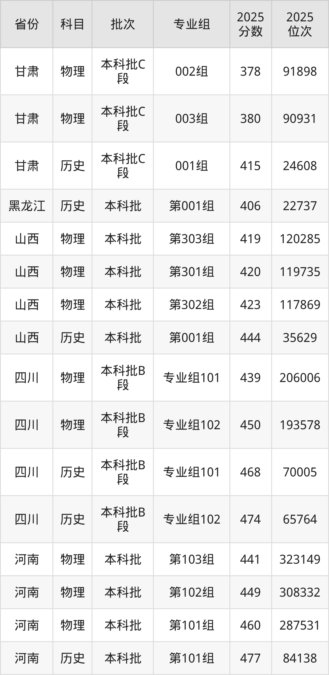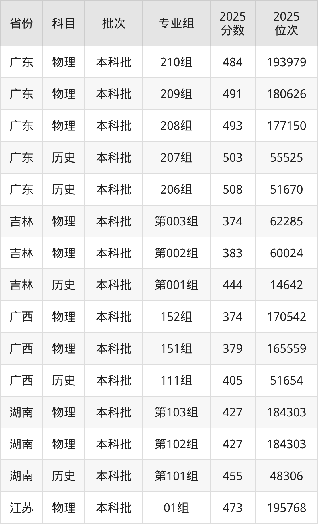 2025年在本科物理类进行招生,各专业组分数线详情如下: