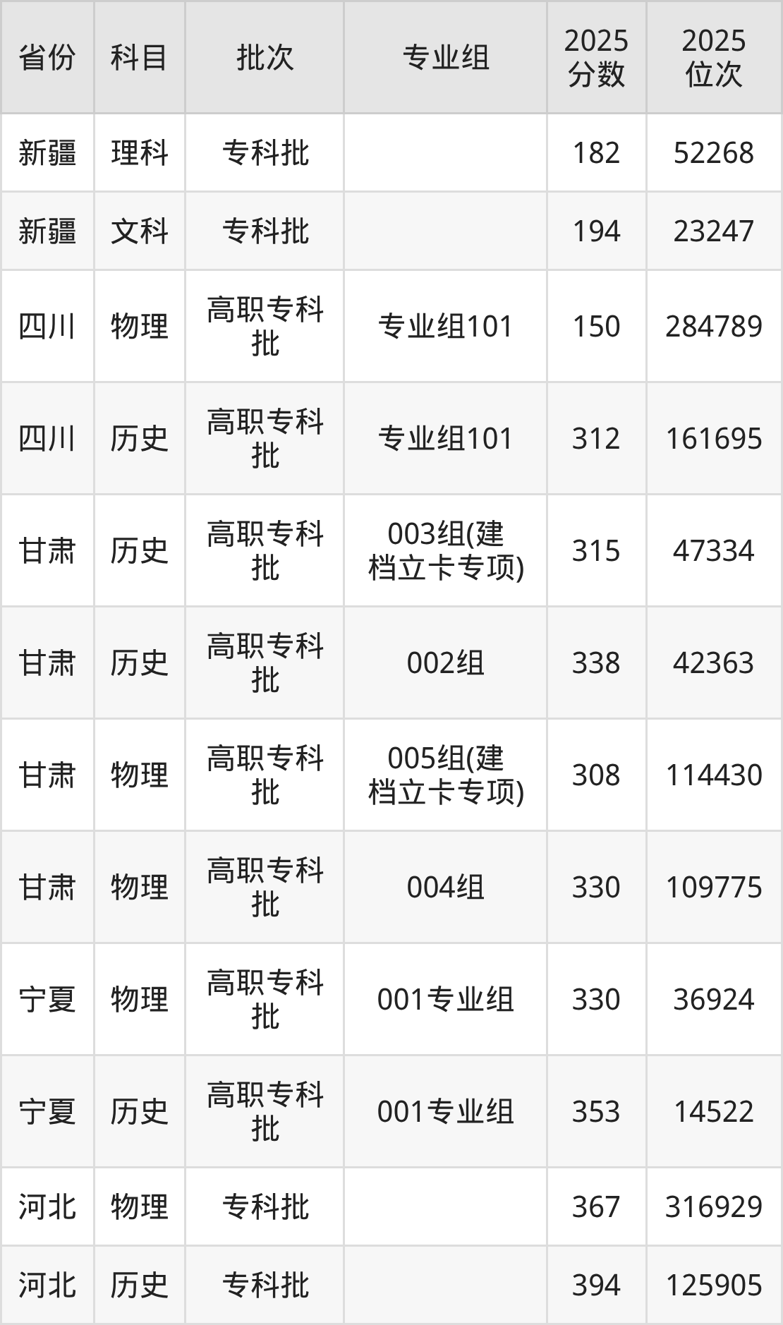 2025年甘肃财贸职业学院全国录取分数线是150分到439分,录取最低在四川物理类(专业组101)、录取最高在河北历史类。各省各专业组最低分具有差异,详情如下: