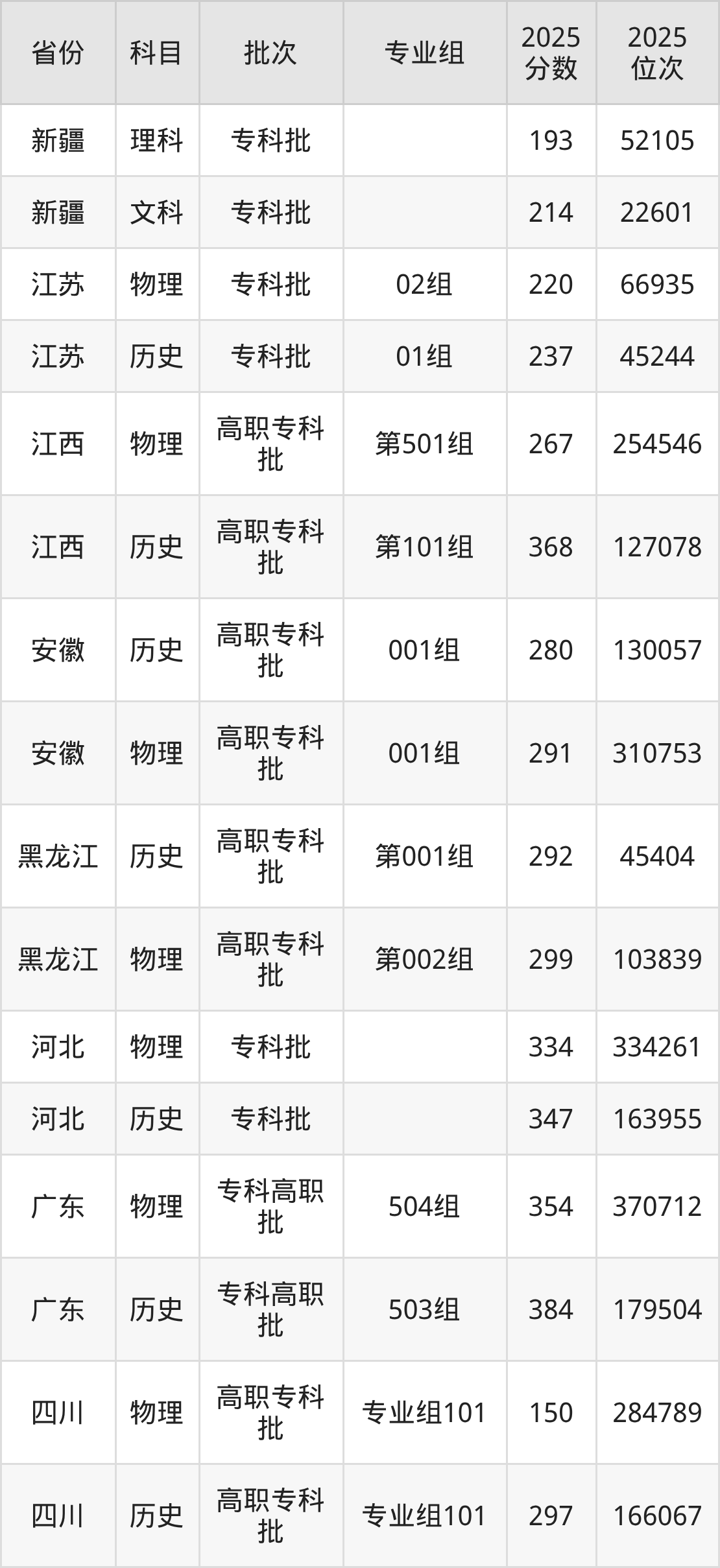 武汉光谷职业学院2025招生录取分数线已公布,2025年武汉光谷职业学院在新疆维吾尔自治区专科理科投档录取最低分193分。在贵州省专科物理类投档录取最低分278分,更多省份具体录取分数线详见下文。