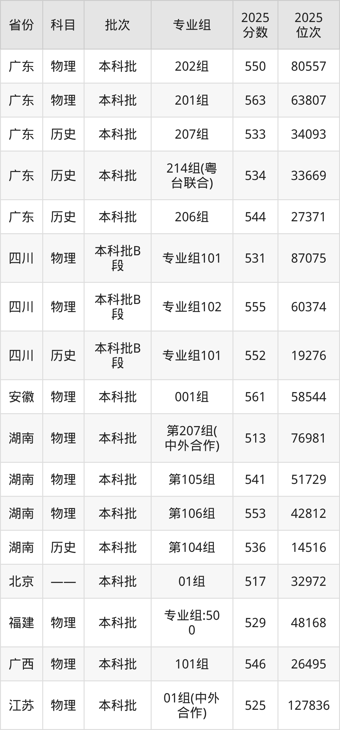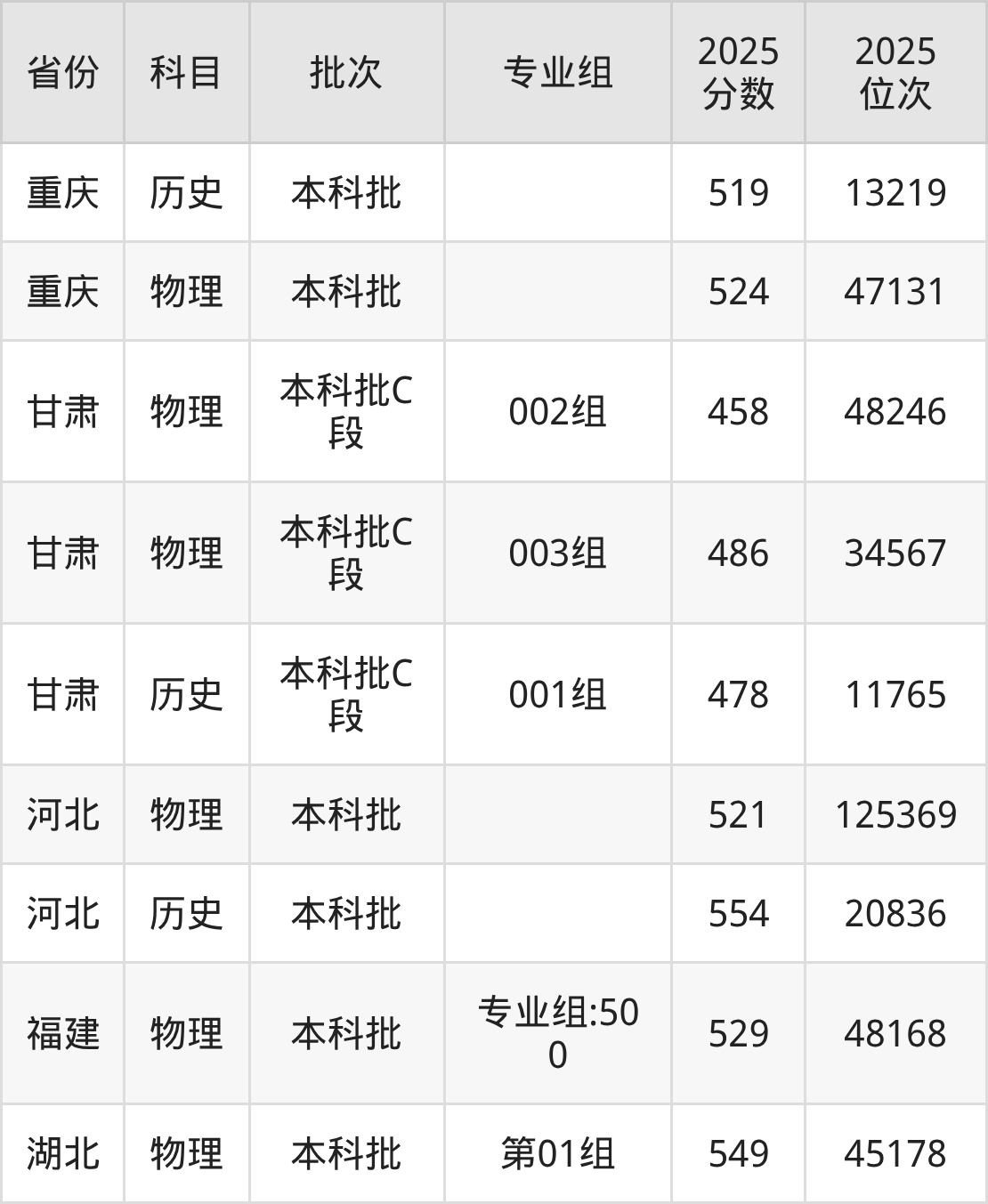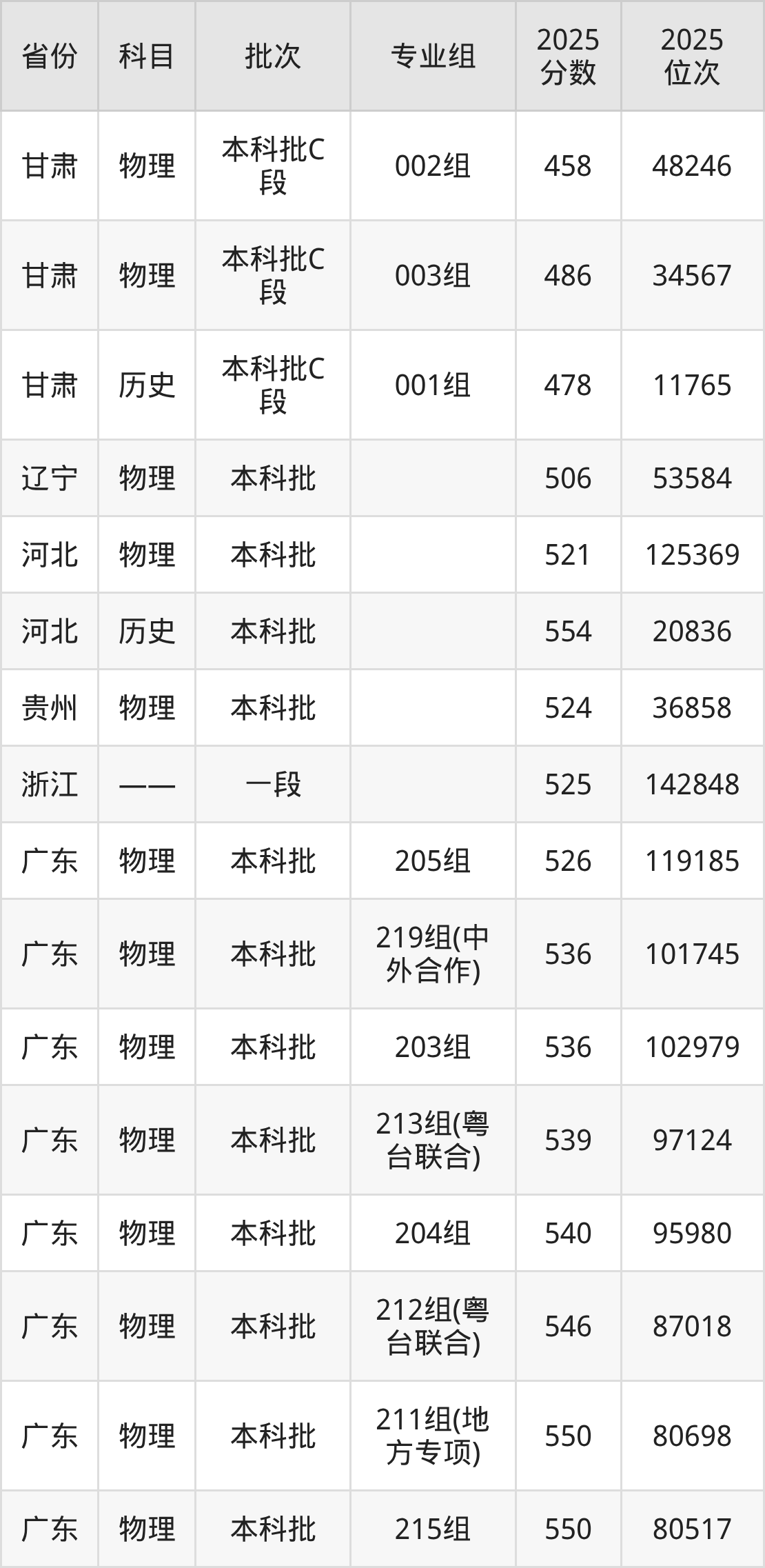 2025年在本科物理类进行招生,各专业组分数线详情如下: