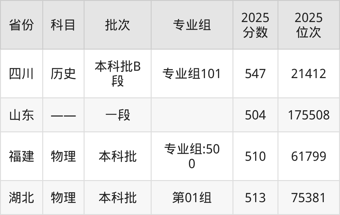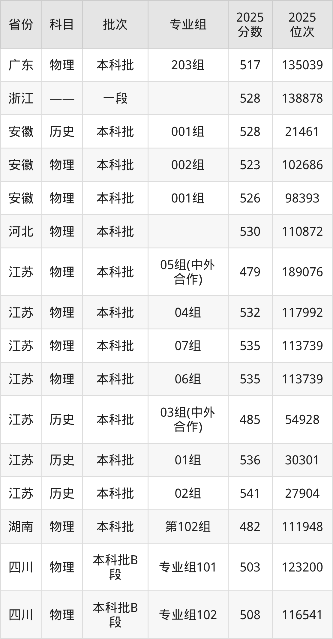 2025年在本科物理类进行招生,各专业组分数线详情如下: