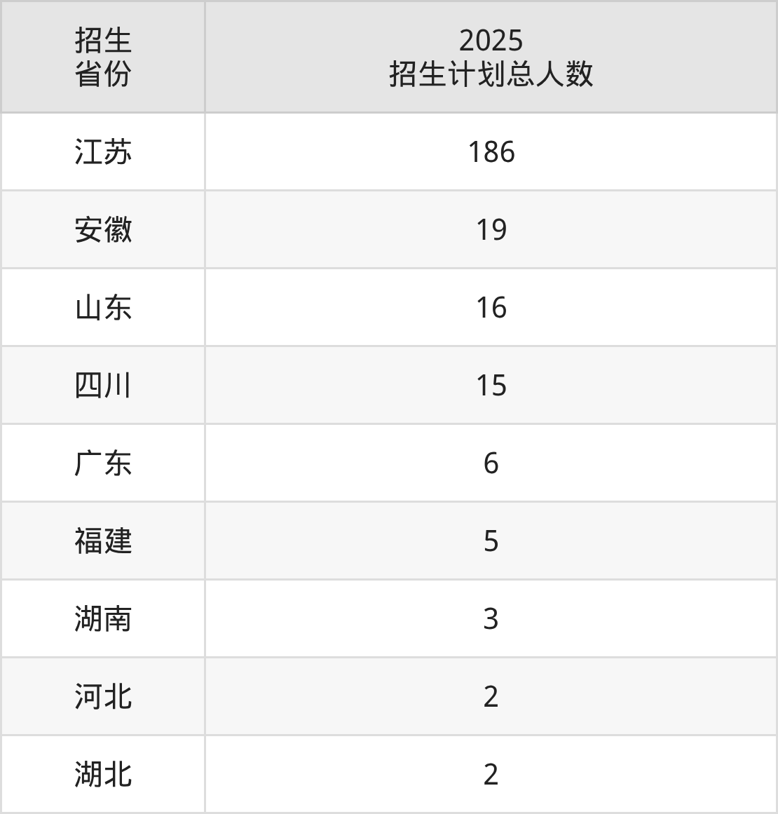 2025年南京体育学院面向全国9个省市开展本科招生;招生专业共5个,招生人数共254人。2025年在江苏省招生计划总人数是186人,其中,南京体育学院在江苏省招生人数最多的是体育经济与管理。南京体育学院在各省具体招生人数情况如下表。