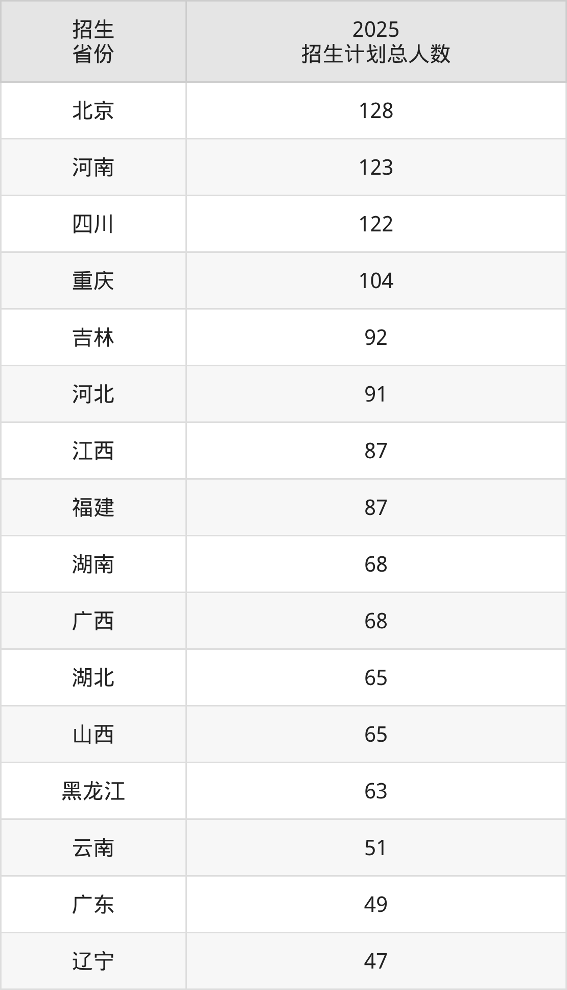 2025年北京师范大学面向全国28个省市开展本科招生;招生专业共39个,招生人数共1584人。2025年在北京市招生计划总人数是128人,其中,北京师范大学在北京市招生人数最多的是物理学类。北京师范大学在各省具体招生人数情况如下表。