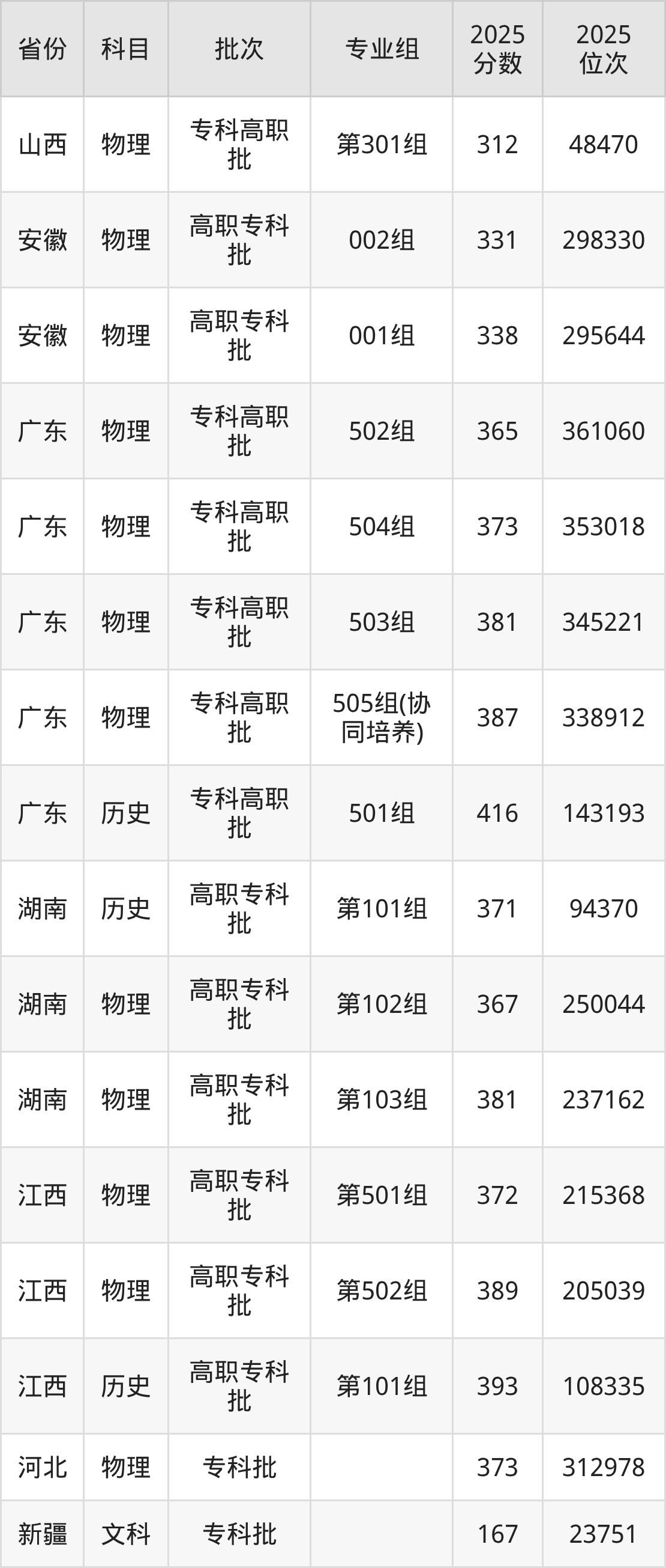 2025年惠州城市职业学院全国录取分数线是167分到416分,录取最低在新疆文科、录取最高在广东历史类(501组)。各省各专业组最低分具有差异,详情如下: