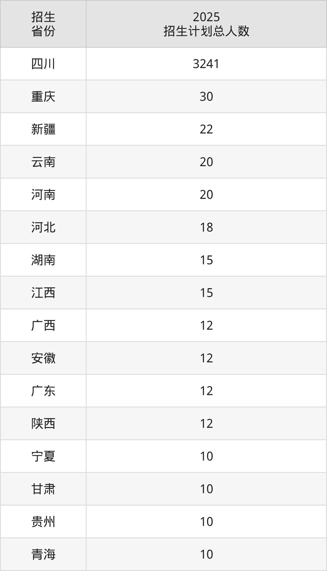 2025年攀枝花学院面向全国28个省市开展本科招生;招生专业共39个,招生人数共3563人。2025年在四川省招生计划总人数是3241人,其中,攀枝花学院在四川省招生人数最多的是材料科学与工程。攀枝花学院在各省具体招生人数情况如下表。