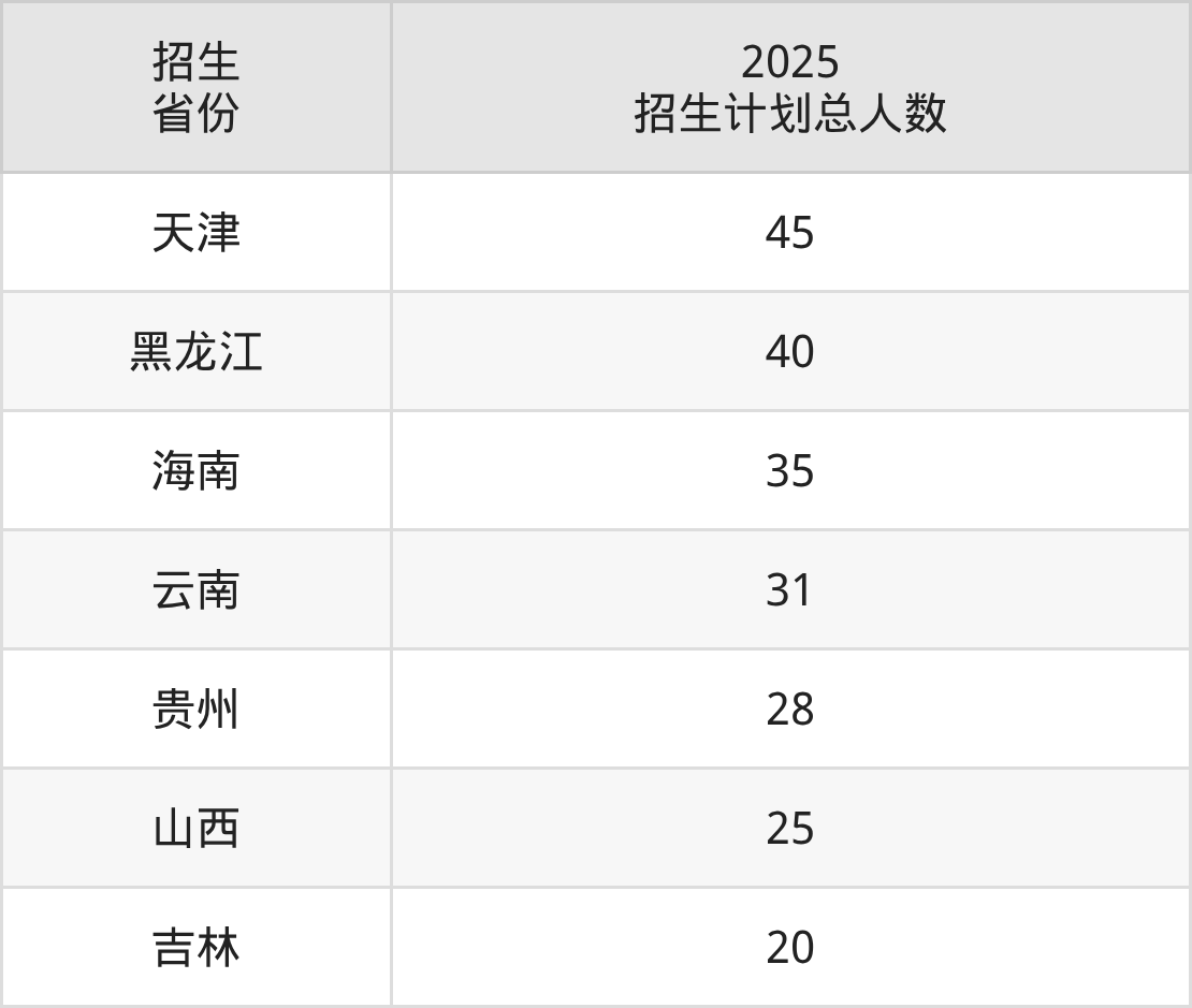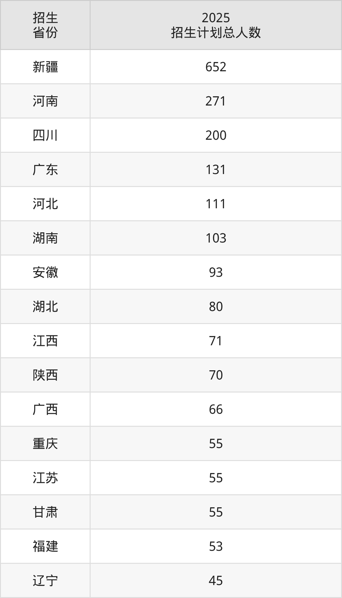 2025年新疆医科大学面向全国23个省市开展本科招生;招生专业共26个,招生人数共2335人。2025年在新疆维吾尔自治区招生计划总人数是652人,其中,新疆医科大学在新疆维吾尔自治区招生人数最多的是临床医学。新疆医科大学在各省具体招生人数情况如下表。