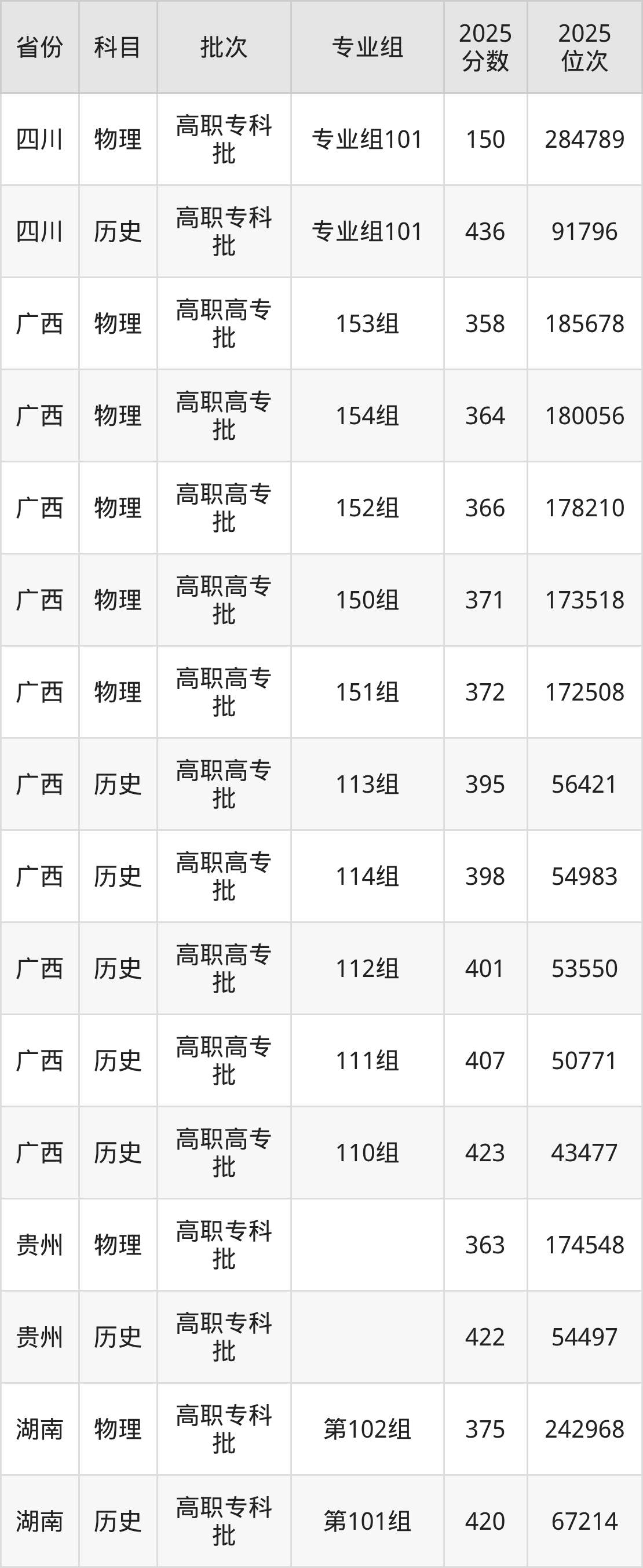 广西卫生职业技术学院专业组101:2025年投档录取最低分为150分,录取最低位次为284789名。