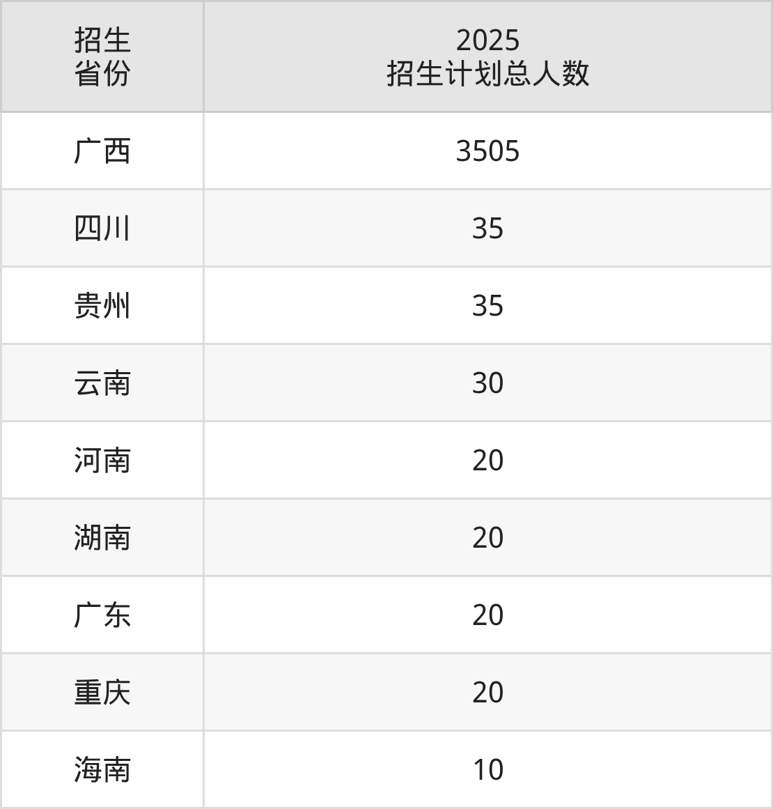 2025年广西卫生职业技术学院面向全国9个省市开展专科招生;招生专业共26个,招生人数共3695人。2025年在广西壮族自治区招生计划总人数是3505人,其中,广西卫生职业技术学院在广西壮族自治区招生人数最多的是临床医学。广西卫生职业技术学院在各省具体招生人数情况如下表。
