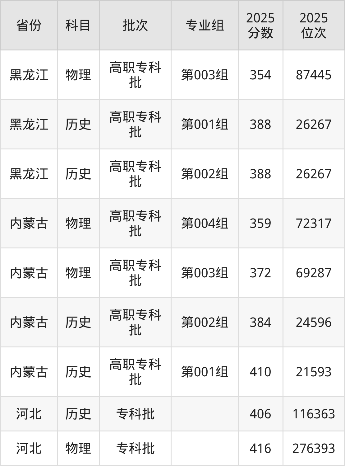 北京劳动保障职业学院第003组:2025年投档录取最低分为354分,录取最低位次为87445名。