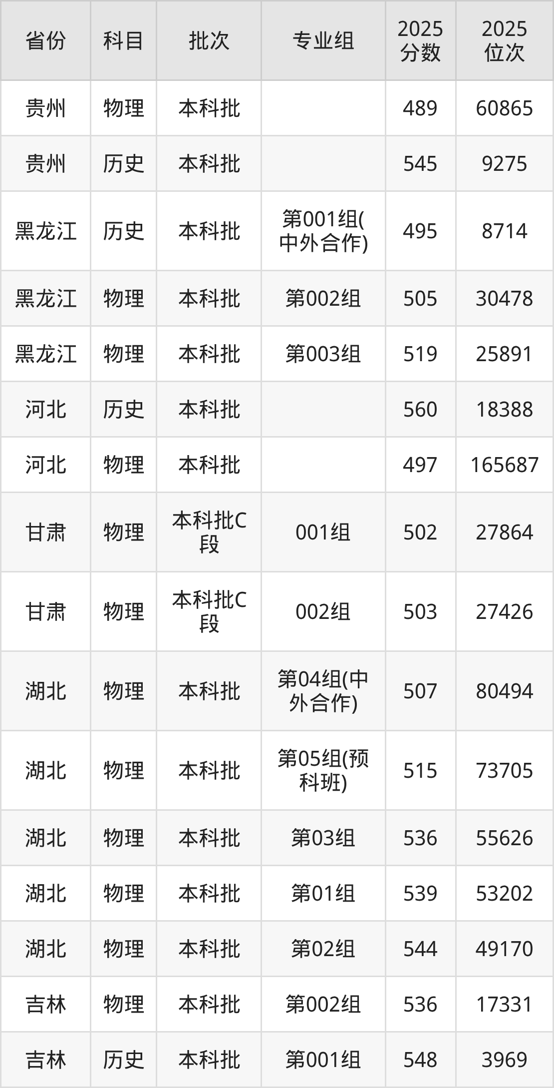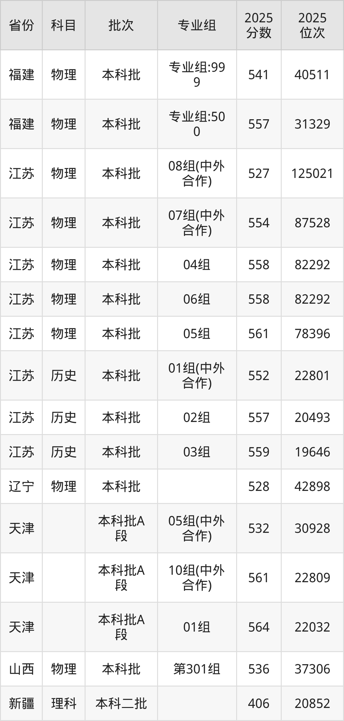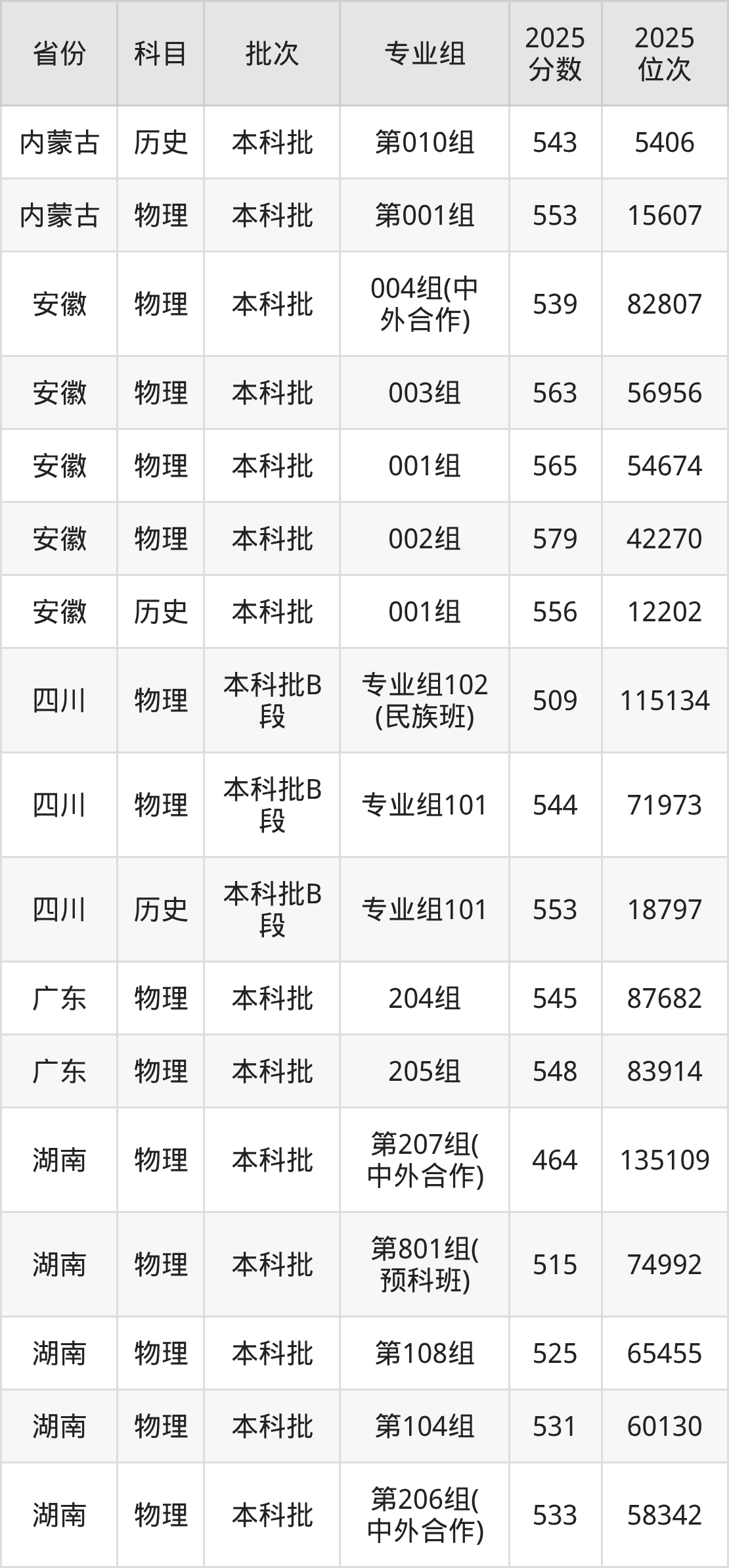 2025年在本科物理类进行招生,各专业组分数线详情如下: