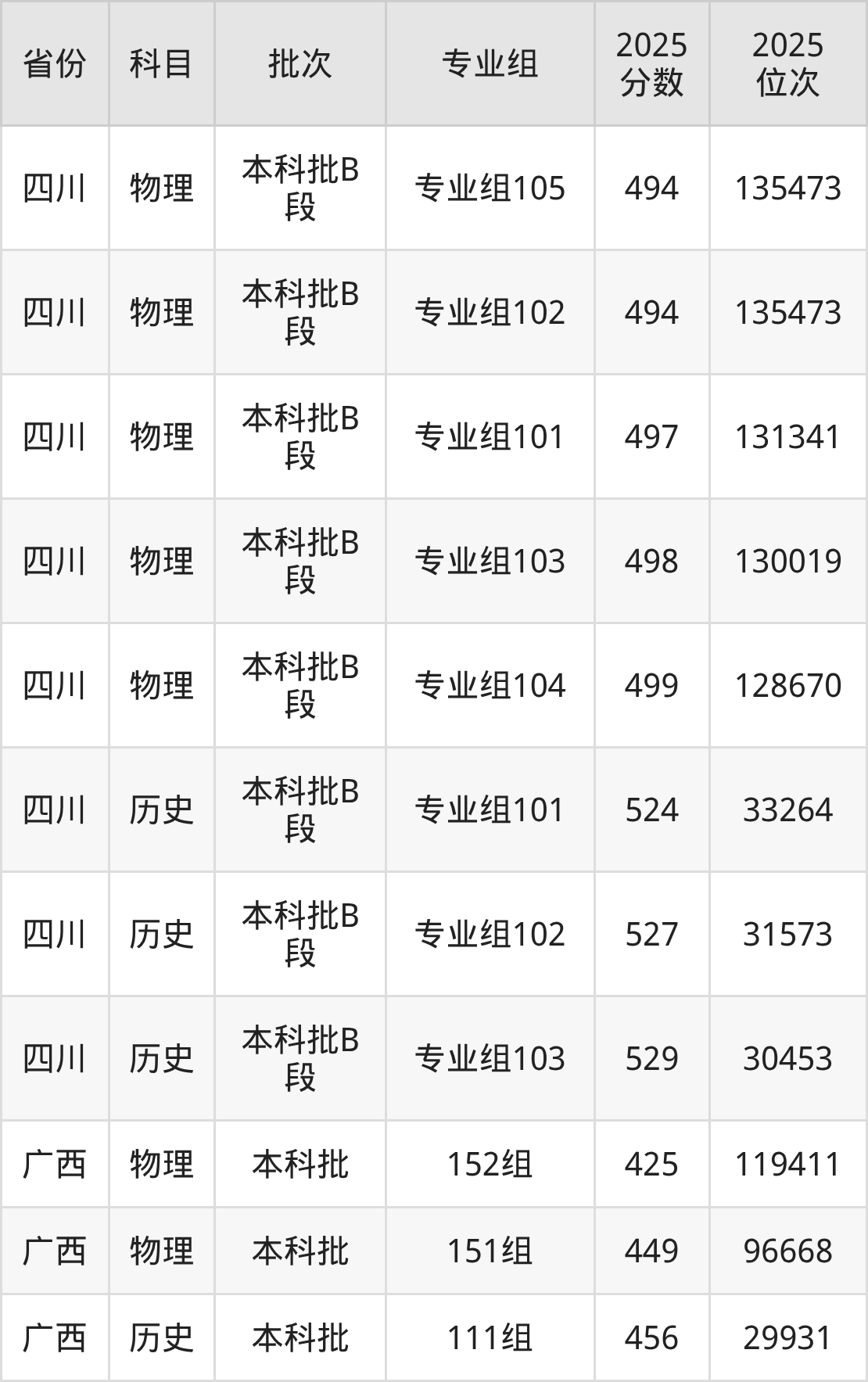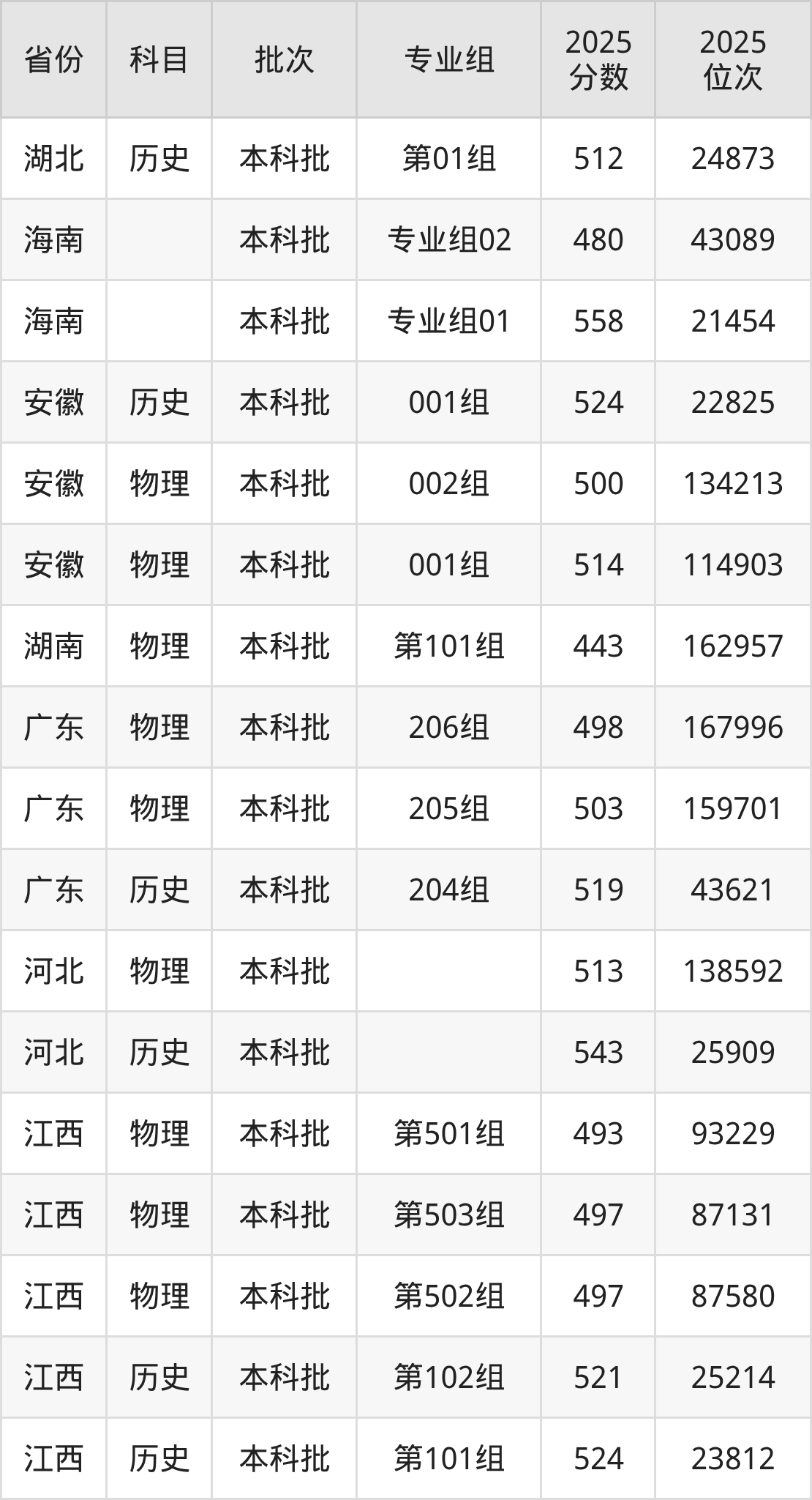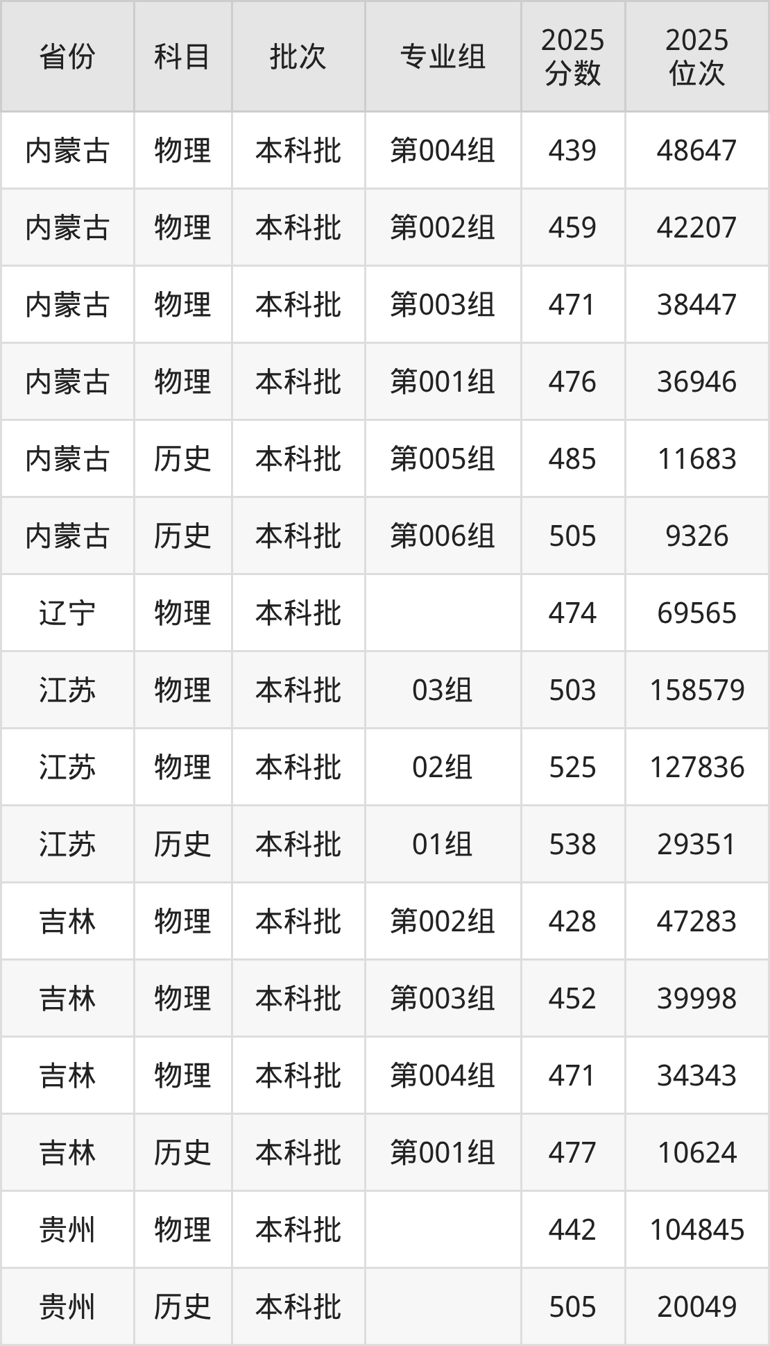 2025年在本科物理类进行招生,各专业组分数线详情如下: