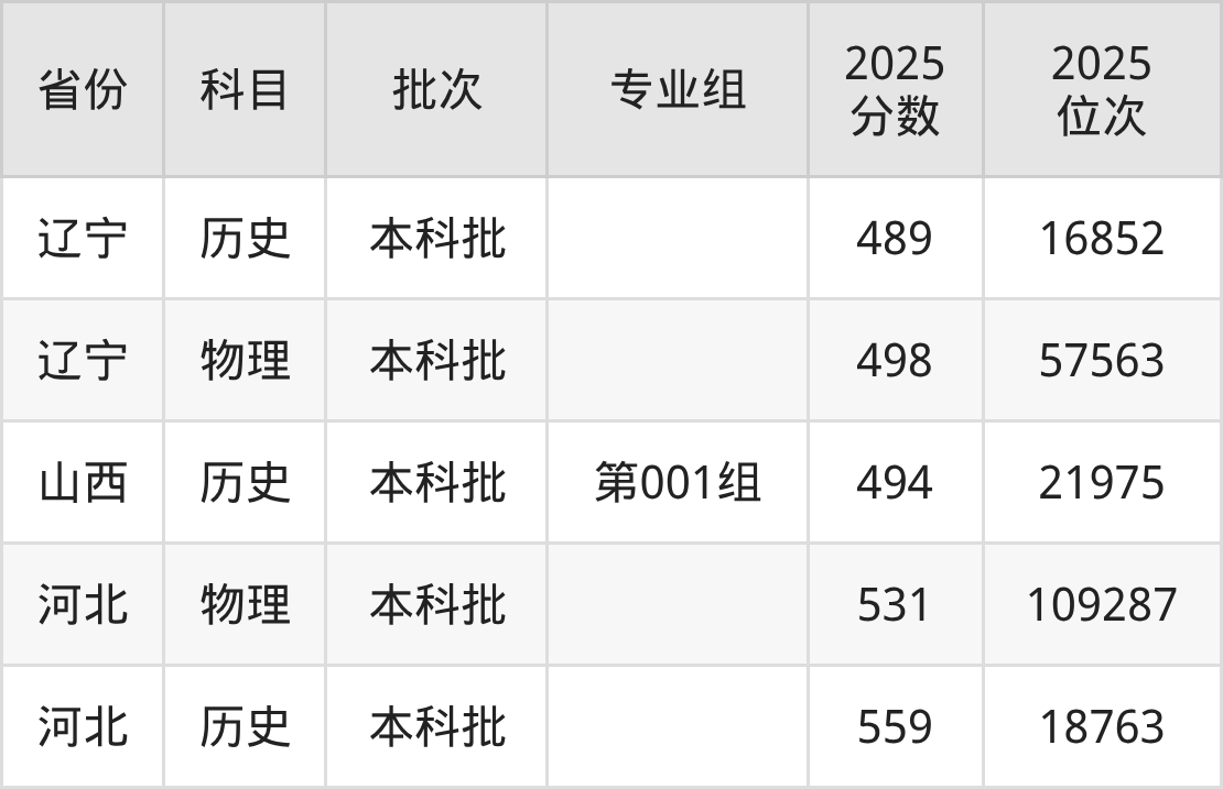 2025年投档录取最低分为489分,录取最低位次为16852名。