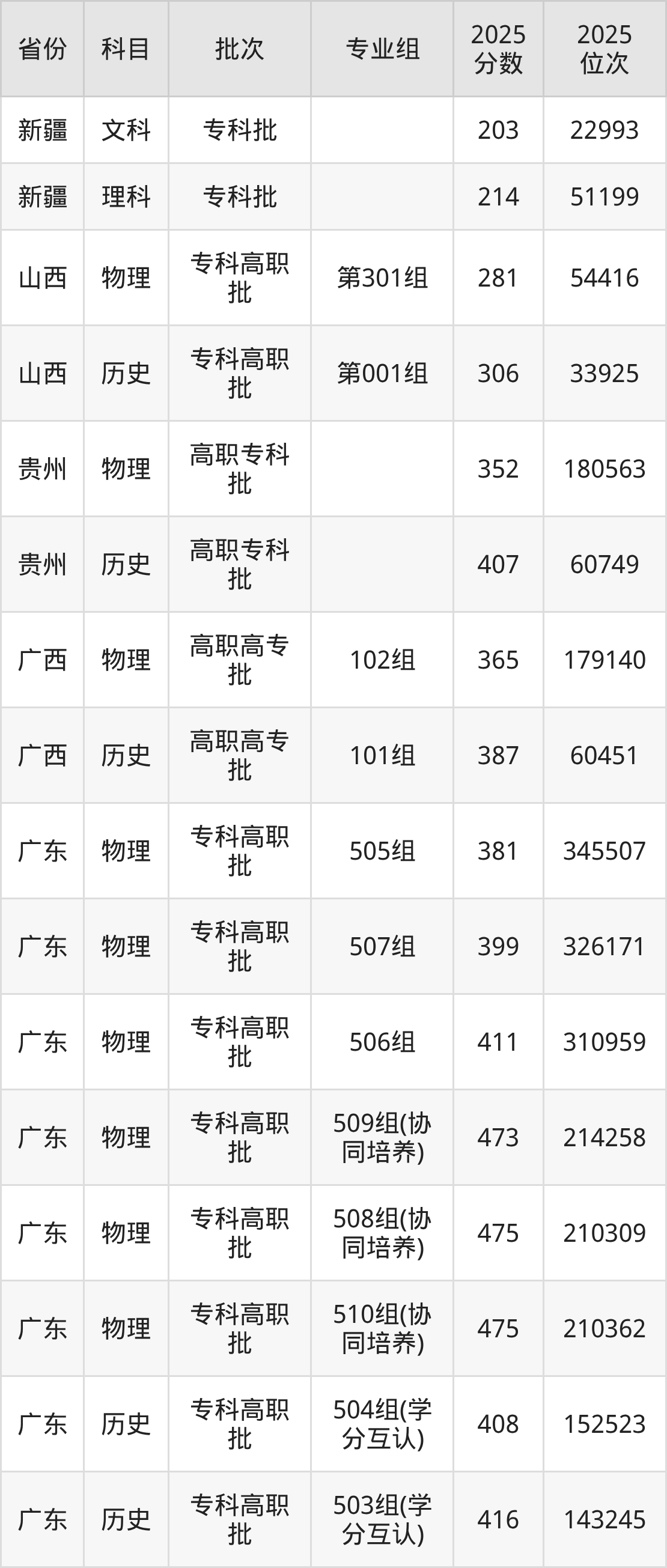 2025年广州工程技术职业学院全国录取分数线是203分到504分,录取最低在新疆文科、录取最高在广东历史类(502组(协同培养))。各省各专业组最低分具有差异,详情如下: