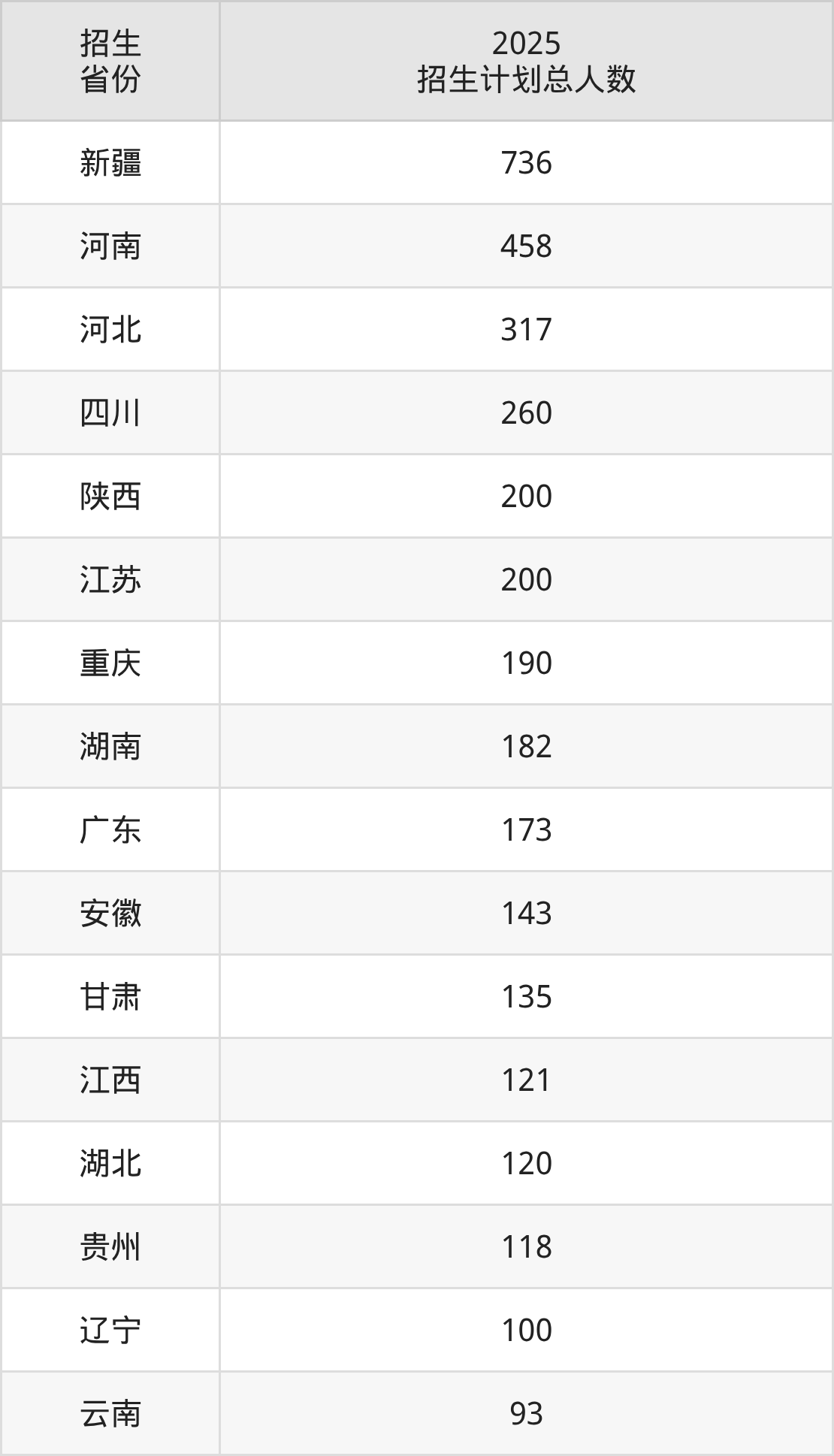 2025年新疆农业大学面向全国28个省市开展本科招生;招生专业共68个,招生人数共4126人。2025年在新疆维吾尔自治区招生计划总人数是736人,其中,新疆农业大学在新疆维吾尔自治区招生人数最多的是中国少数民族语言文学。新疆农业大学在各省具体招生人数情况如下表。