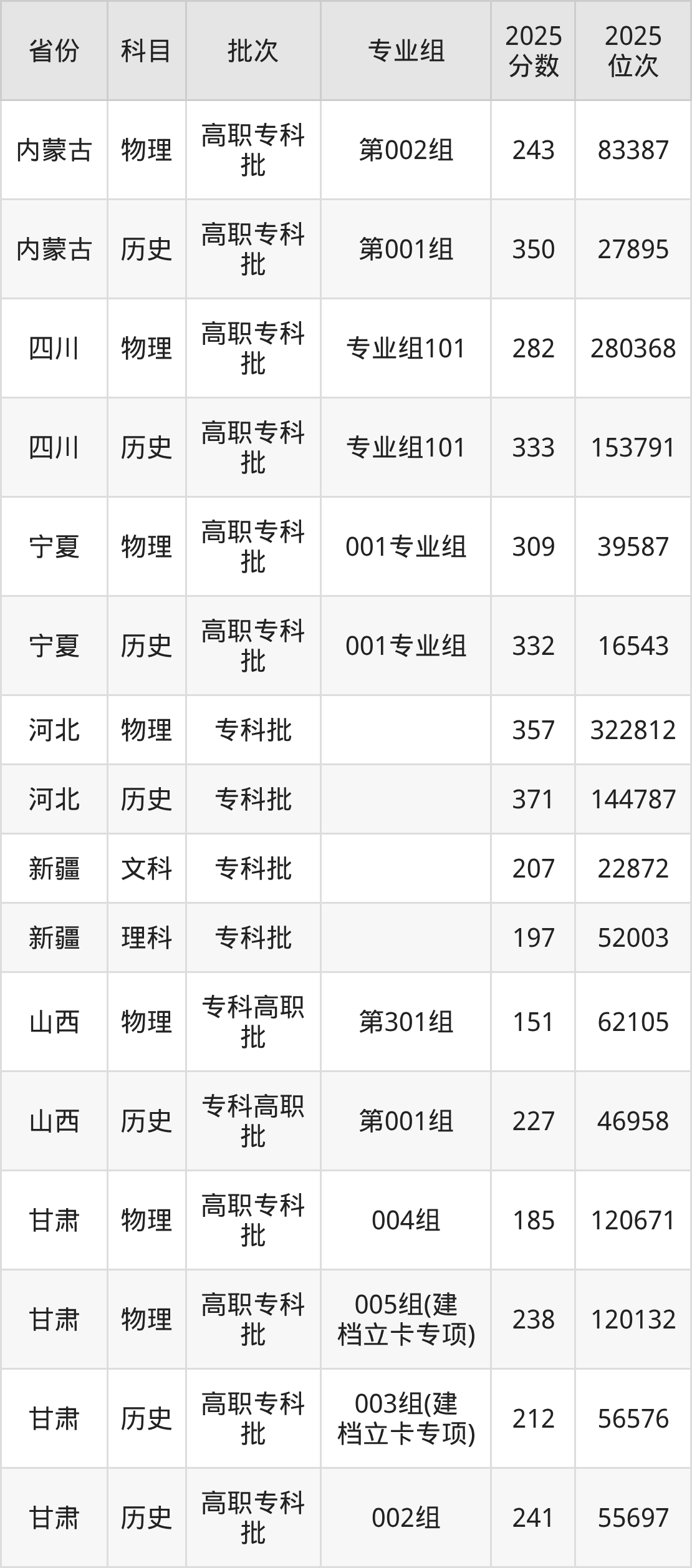 白银矿冶职业技术学院第002组:2025年投档录取最低分为243分,录取最低位次为83387名。