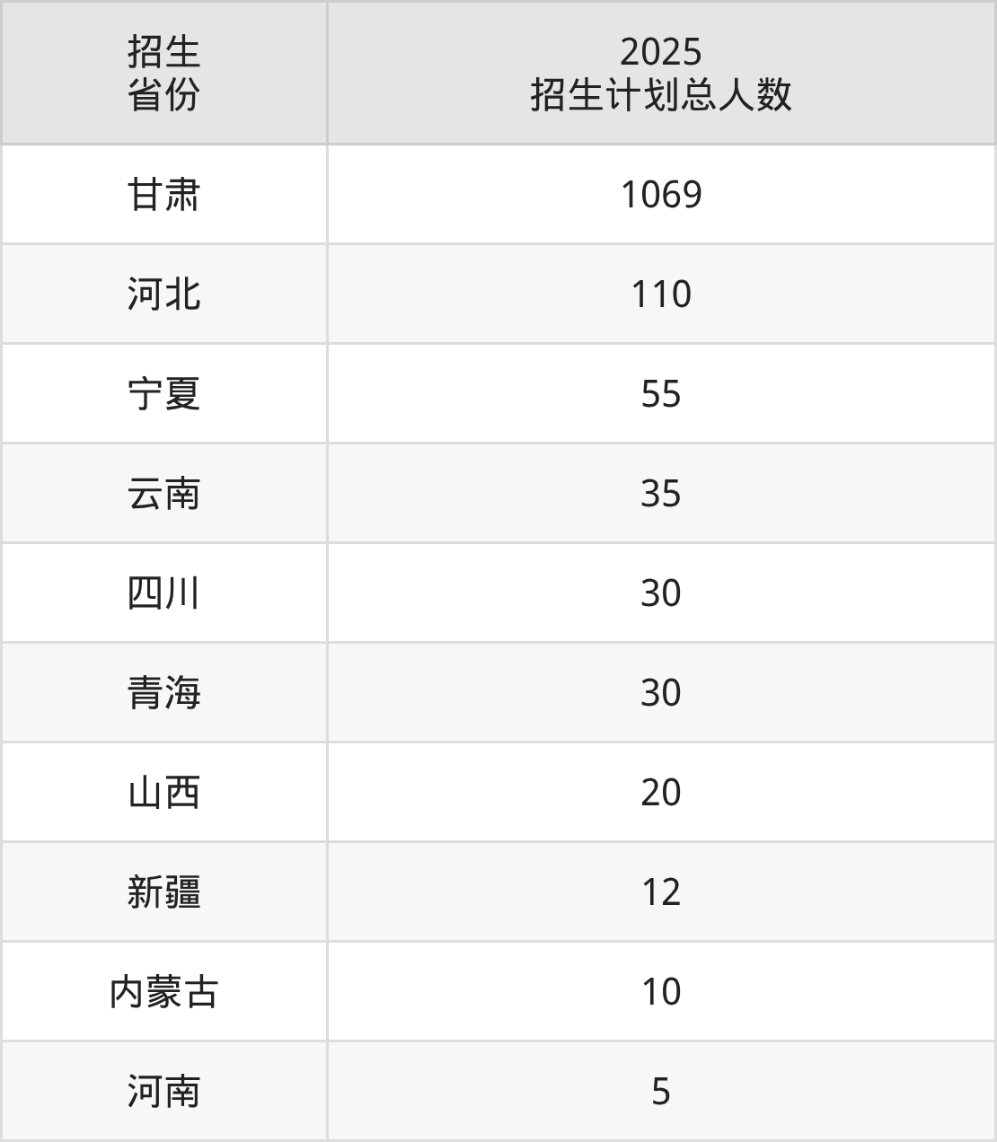 2025年白银矿冶职业技术学院面向全国10个省市开展专科招生;招生专业共33个,招生人数共1376人。2025年在甘肃省招生计划总人数是1069人,其中,白银矿冶职业技术学院在甘肃省招生人数最多的是工程测量技术。白银矿冶职业技术学院在各省具体招生人数情况如下表。