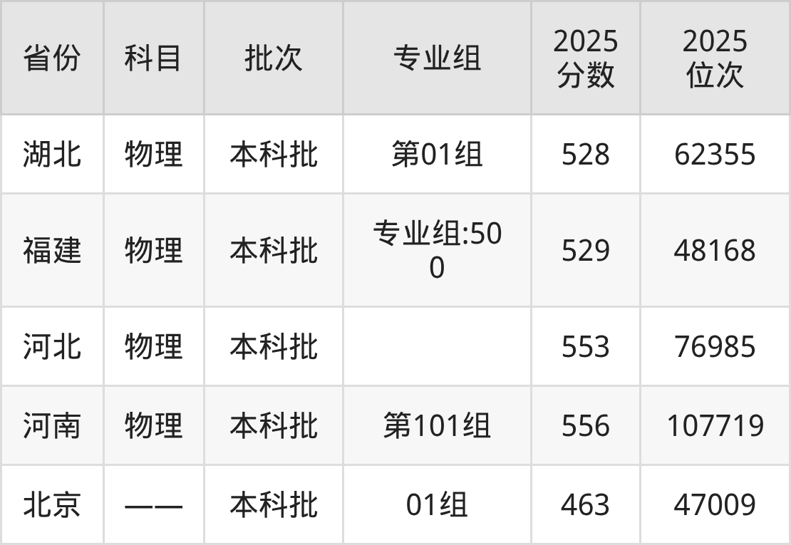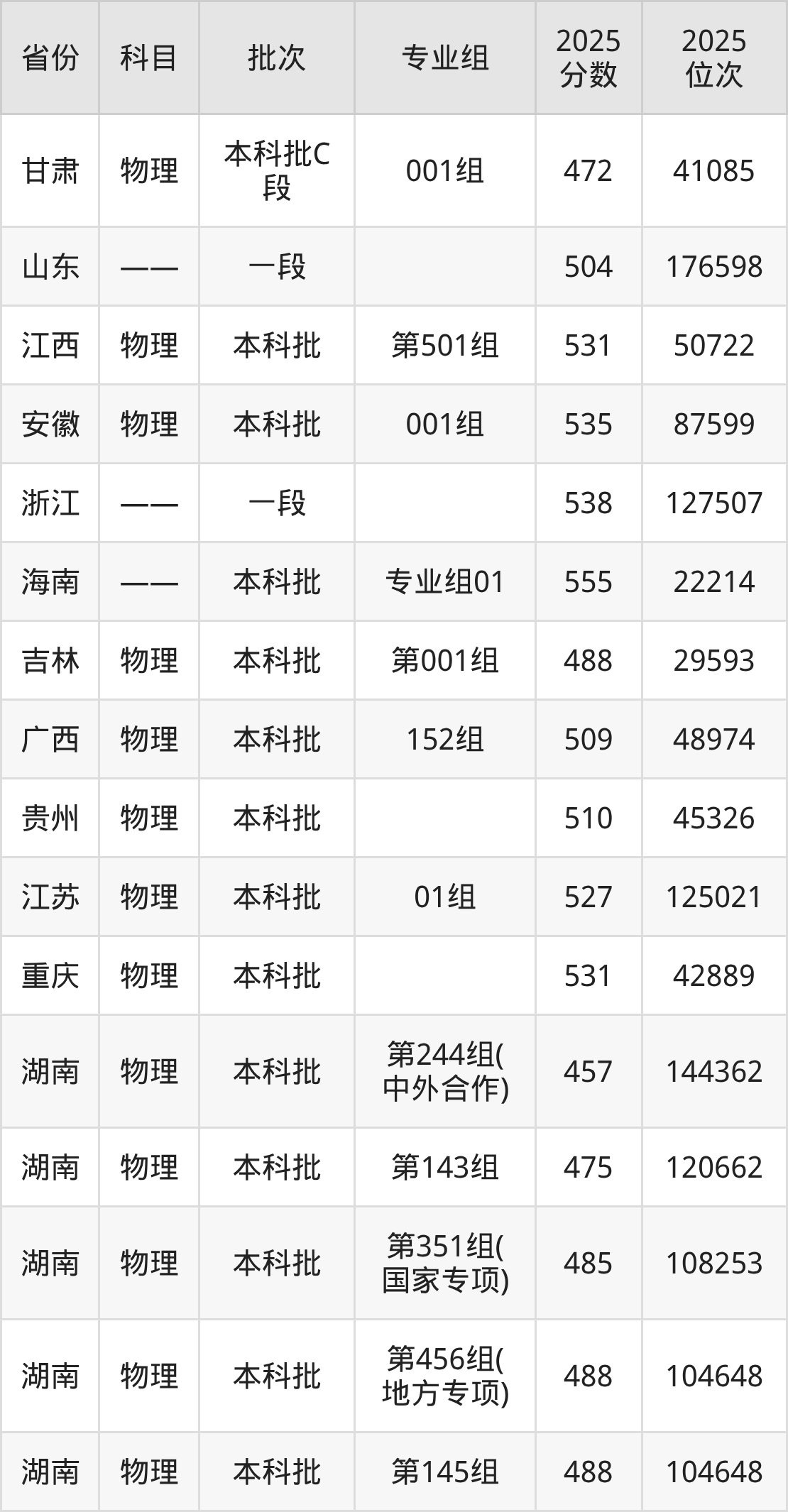 2025年在本科物理类进行招生,各专业组分数线详情如下: