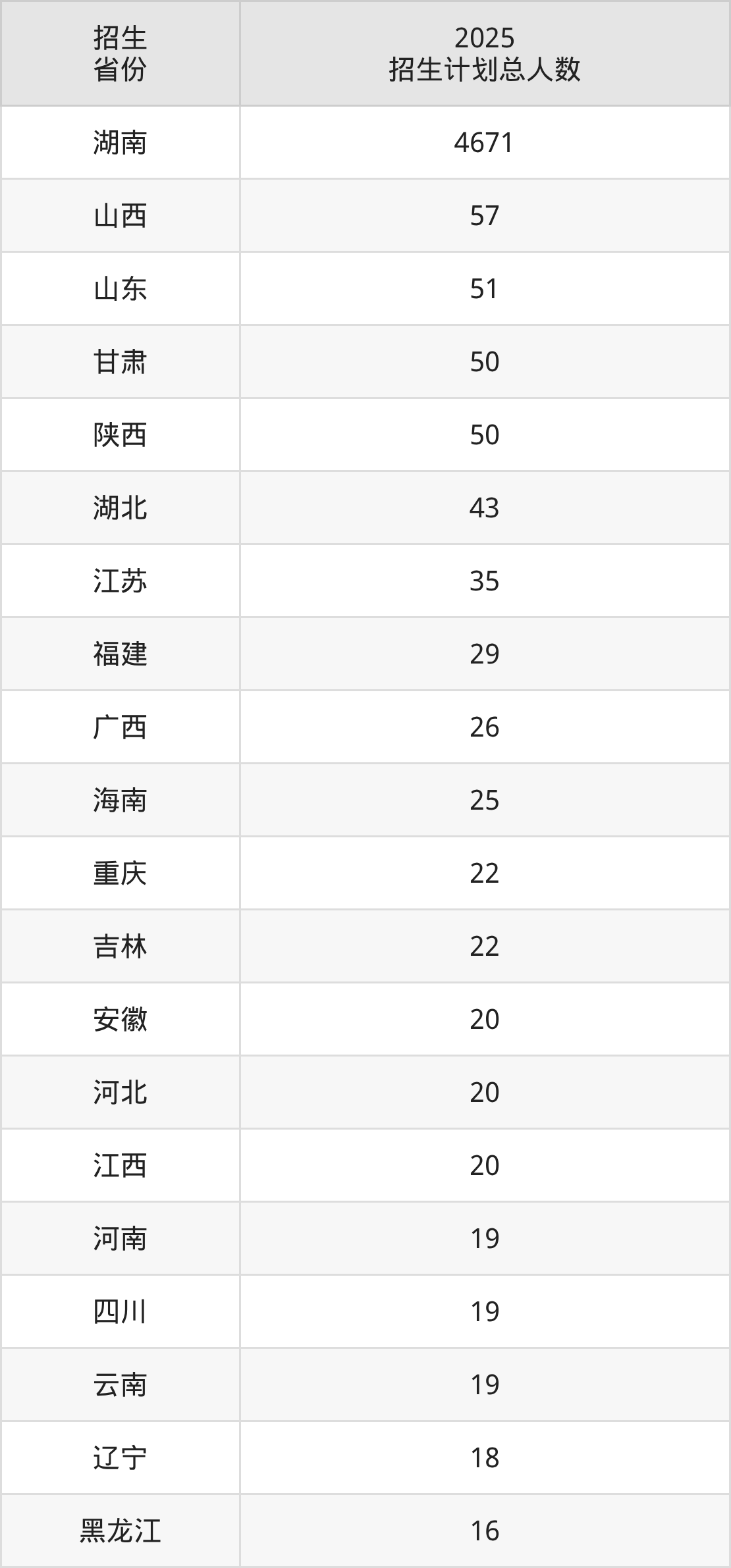 2025年湖南第一师范学院面向全国22个省市开展本科招生;招生专业共34个,招生人数共5245人。2025年在湖南省招生计划总人数是4671人,其中,湖南第一师范学院在湖南省招生人数最多的是汉语言文学。湖南第一师范学院在各省具体招生人数情况如下表。