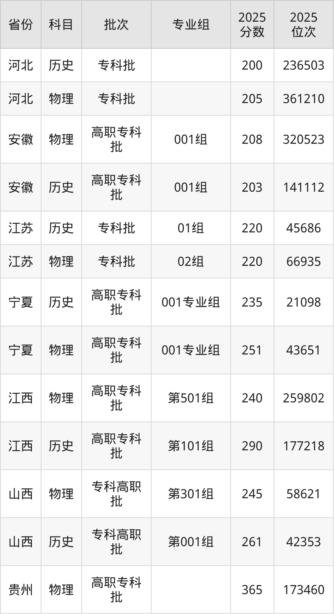 2025年在专科物理类进行招生,各专业组分数线详情如下: