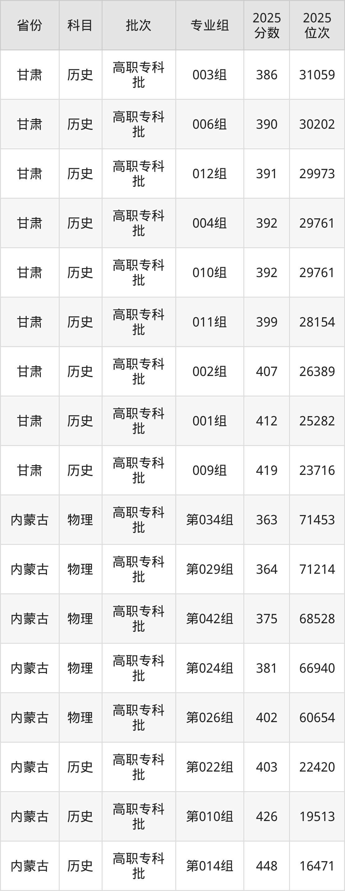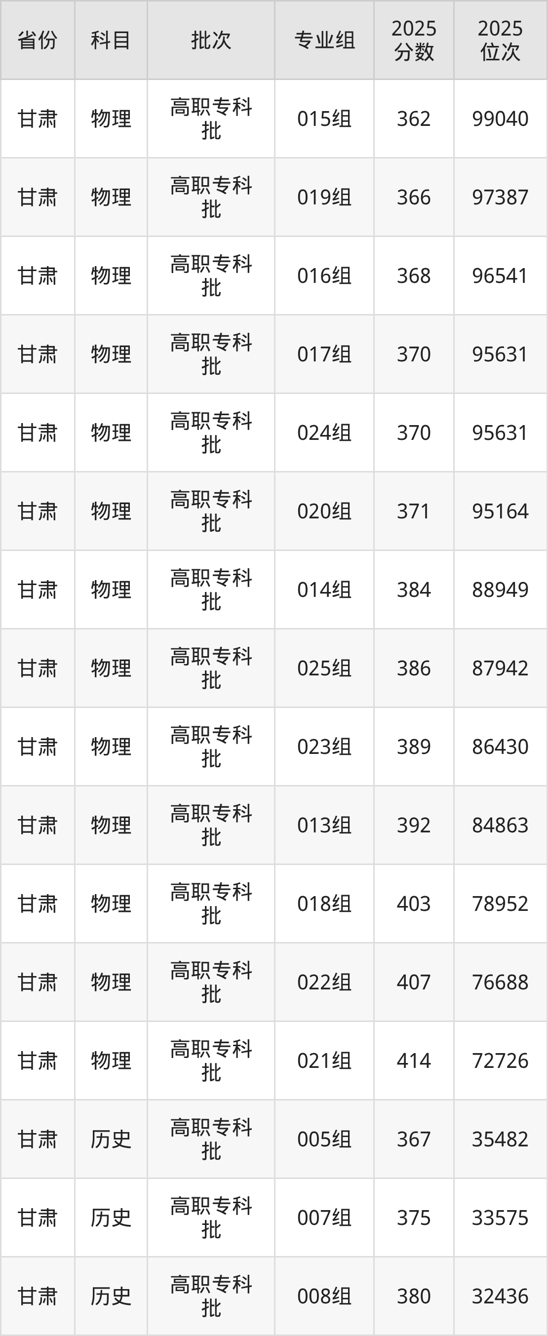 普通类专科历史类最低405分,专科物理类最低382分