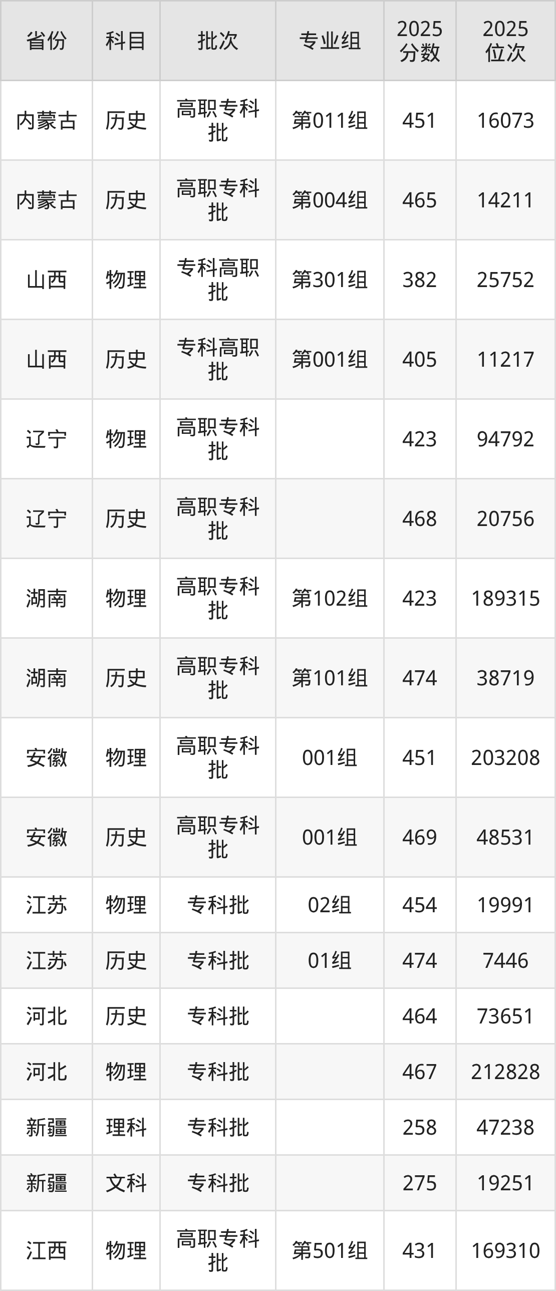 普通类专科物理类最低451分,专科历史类最低469分