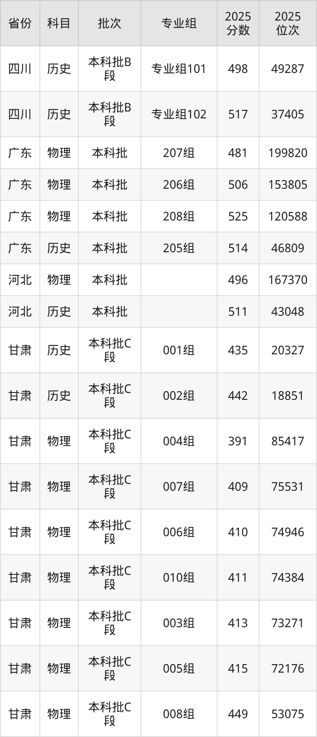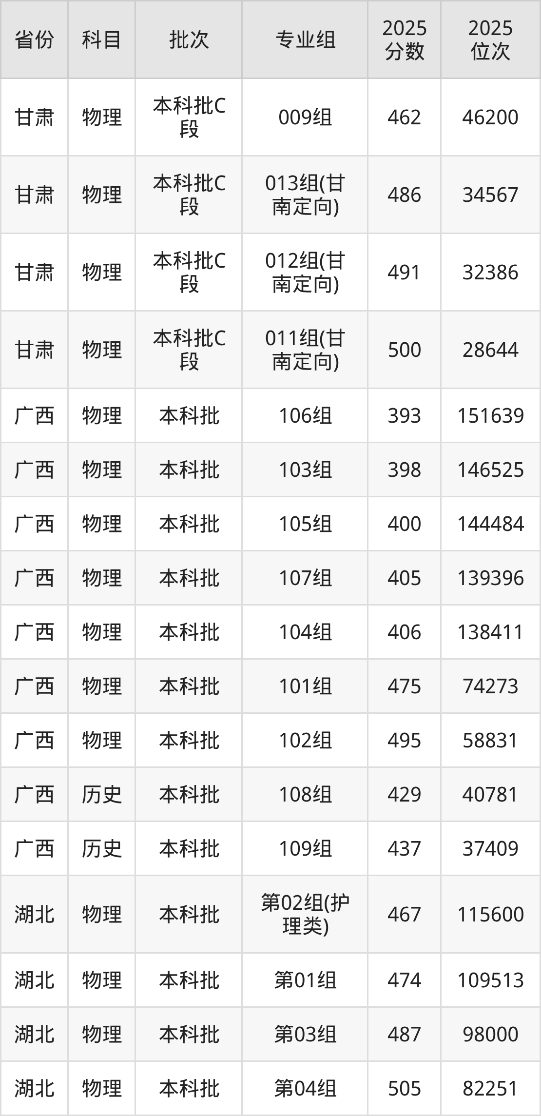 2025年在本科物理类进行招生,各专业组分数线详情如下: