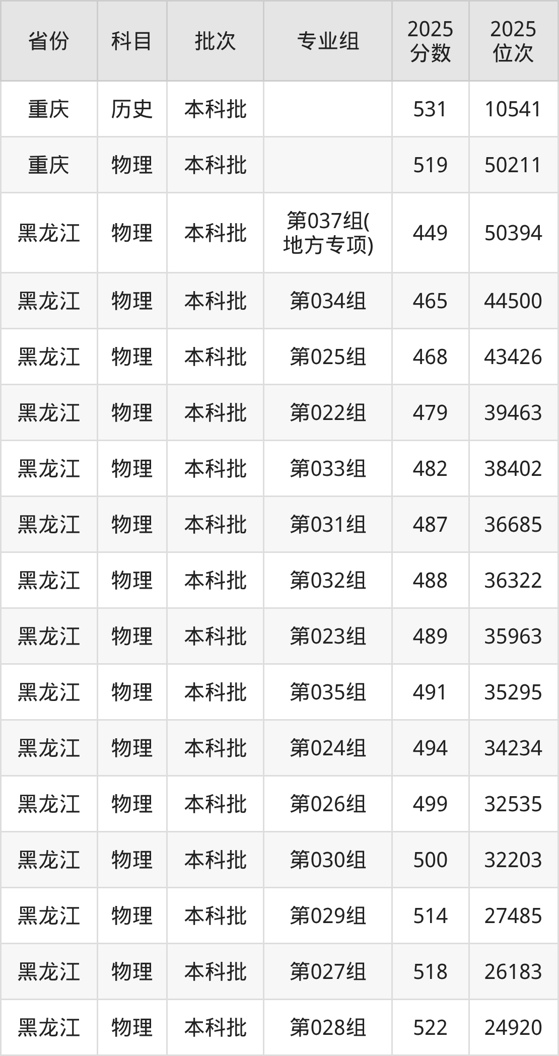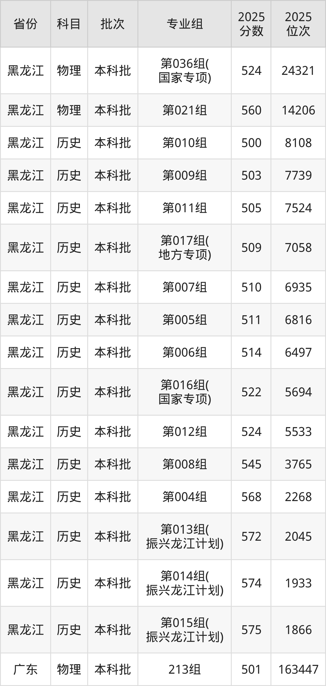 黑龙江大学第010组:2025年投档录取最低分为500分,录取最低位次为8108名。