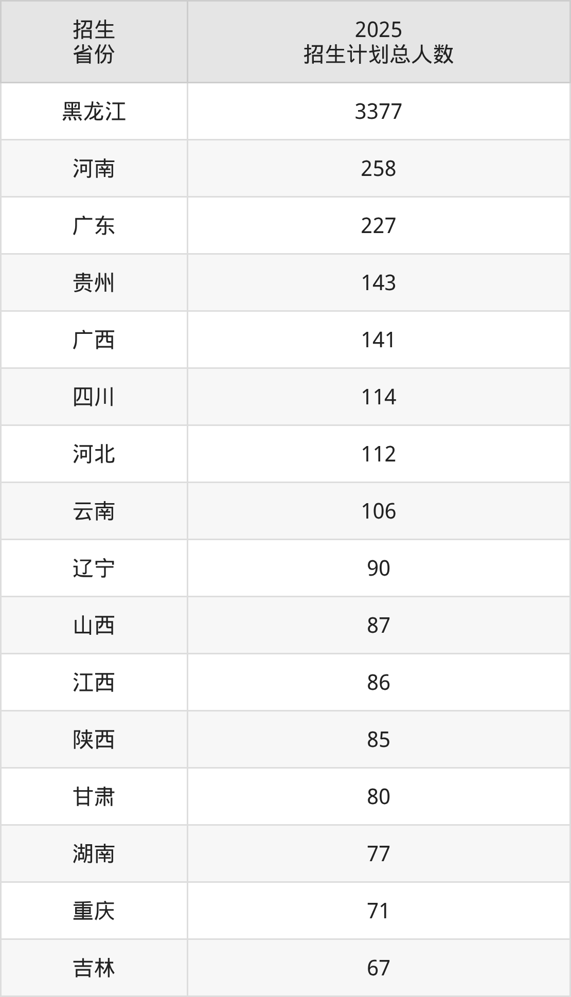 2025年黑龙江大学面向全国28个省市开展本科招生;招生专业共70个,招生人数共5579人。2025年在黑龙江省招生计划总人数是3377人,其中,黑龙江大学在黑龙江省招生人数最多的是软件工程。黑龙江大学在各省具体招生人数情况如下表。