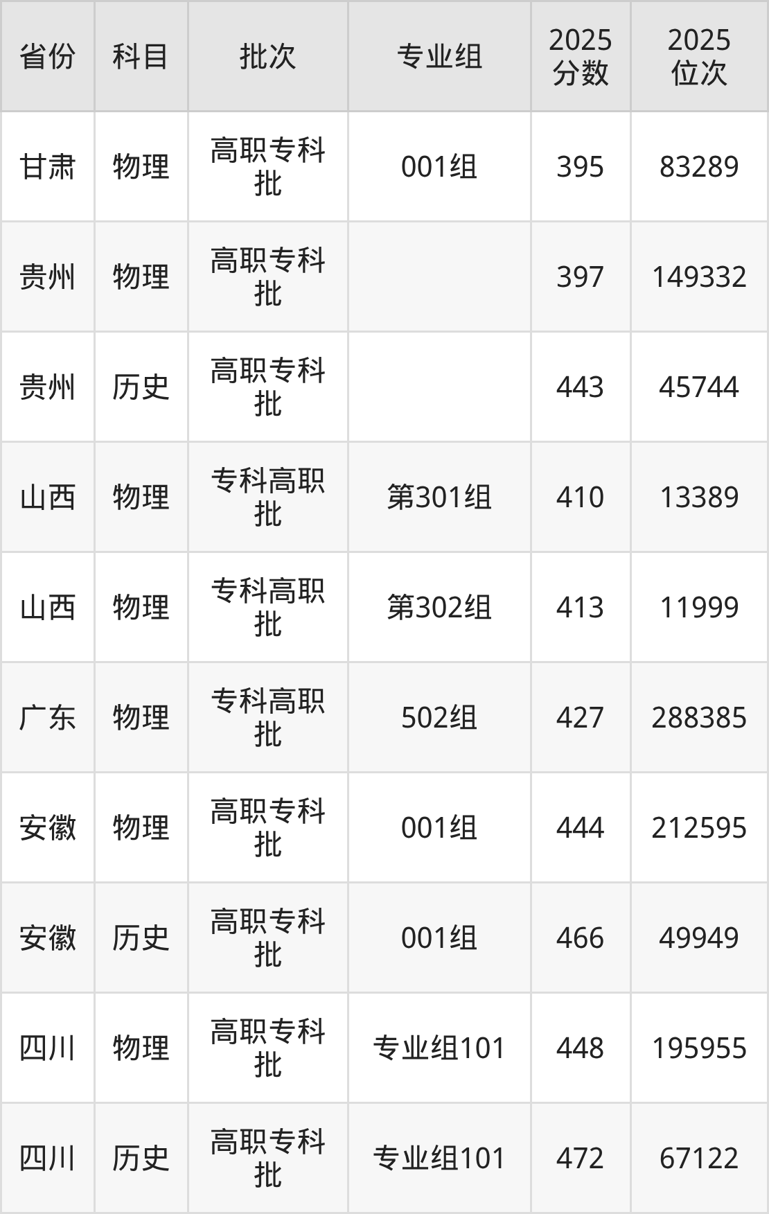 2025年在专科物理类进行招生,各专业组分数线详情如下: