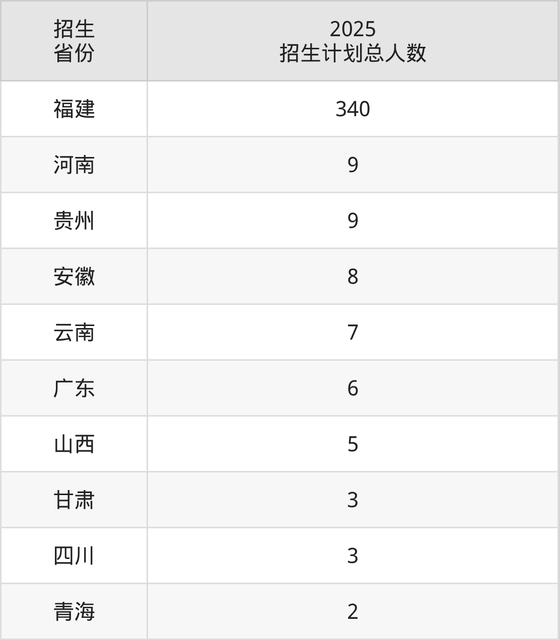 2025年福建电力职业技术学院面向全国10个省市开展专科招生;招生专业共9个,招生人数共392人。2025年在福建省招生计划总人数是340人,其中,福建电力职业技术学院在福建省招生人数最多的是电力技术类。福建电力职业技术学院在各省具体招生人数情况如下表。
