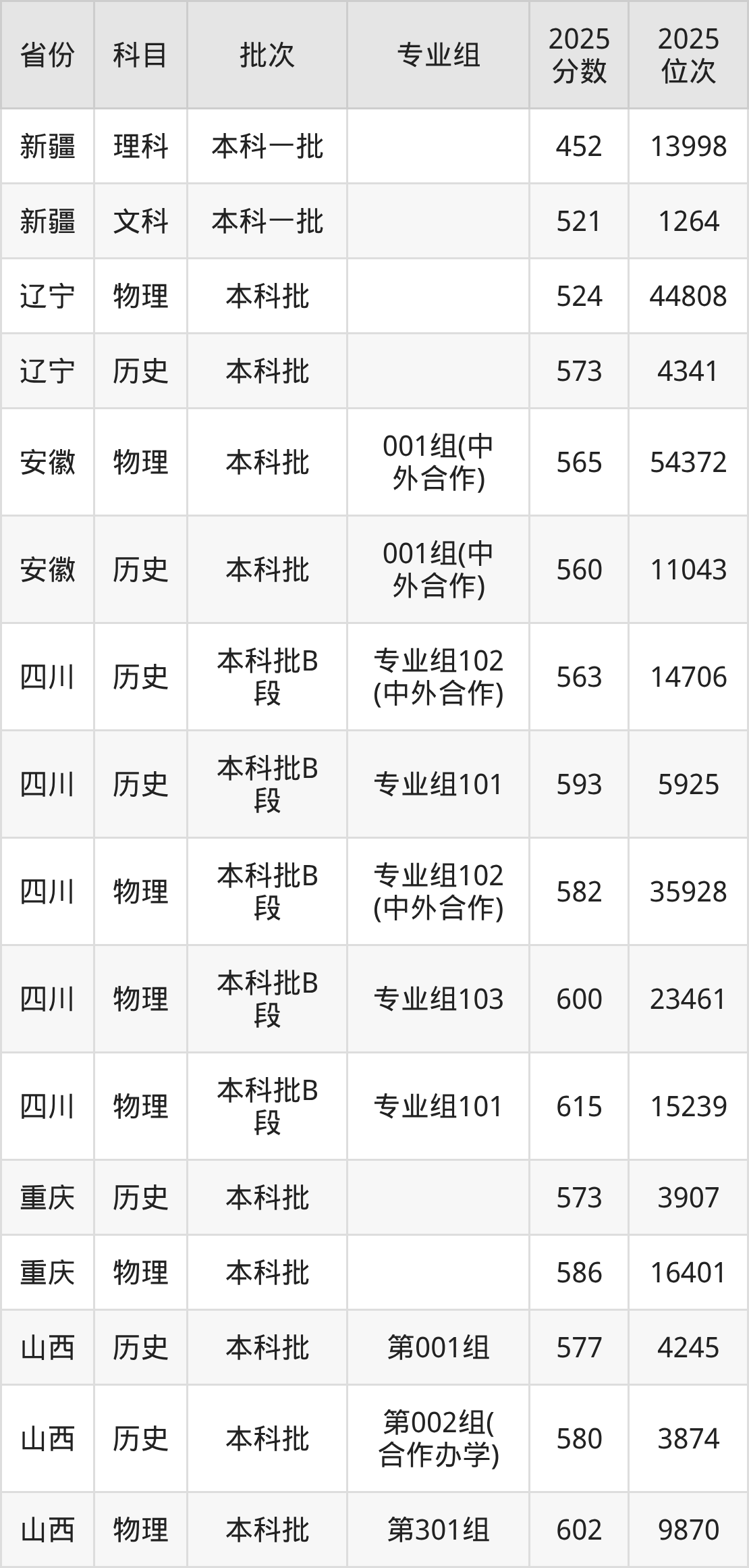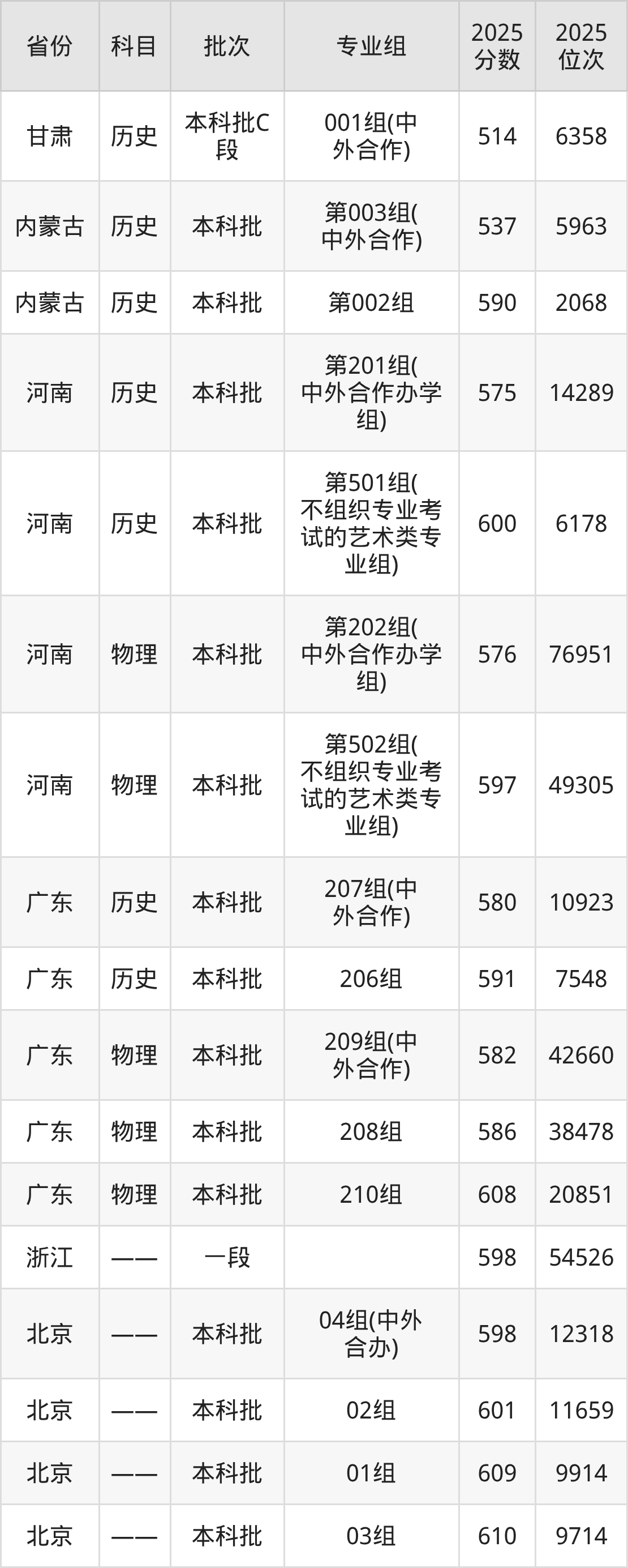 中央美术学院001组(中外合作办学):2025年投档录取最低分为565分,录取最低位次为54372名。