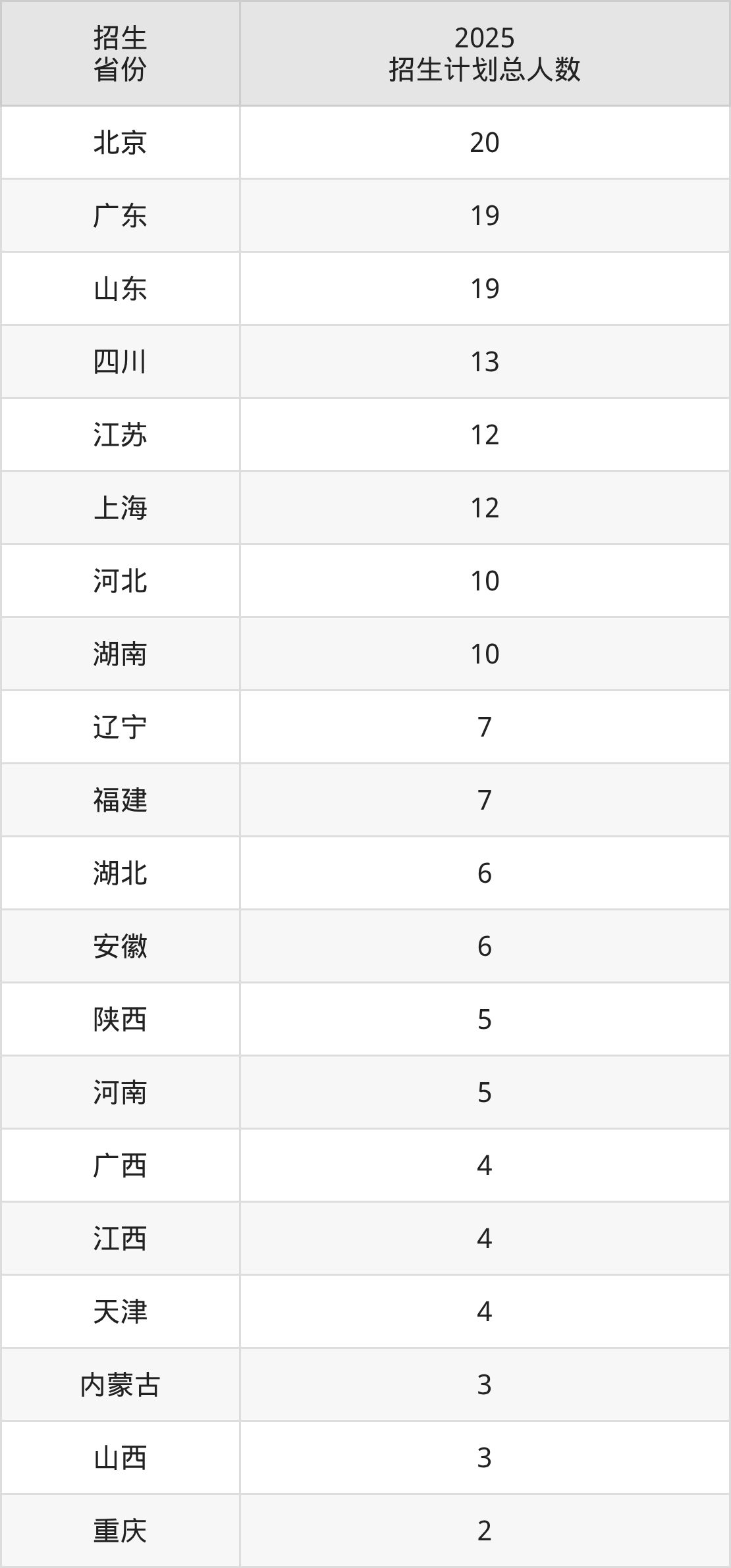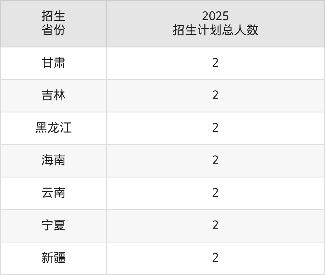 2025年中央美术学院面向全国27个省市开展本科招生;招生专业共7个,招生人数共185人。2025年在北京市招生计划总人数是20人,其中,中央美术学院在北京市招生人数最多的是艺术史论。中央美术学院在各省具体招生人数情况如下表。