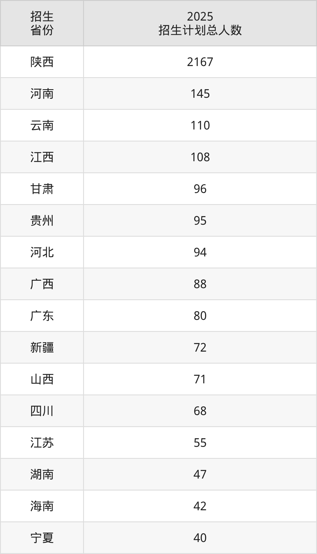 2025年西安翻译学院面向全国25个省市开展本科招生;招生专业共30个,招生人数共3291人。2025年在陕西省招生计划总人数是2167人,其中,西安翻译学院在陕西省招生人数最多的是汉语言文学。西安翻译学院在各省具体招生人数情况如下表。