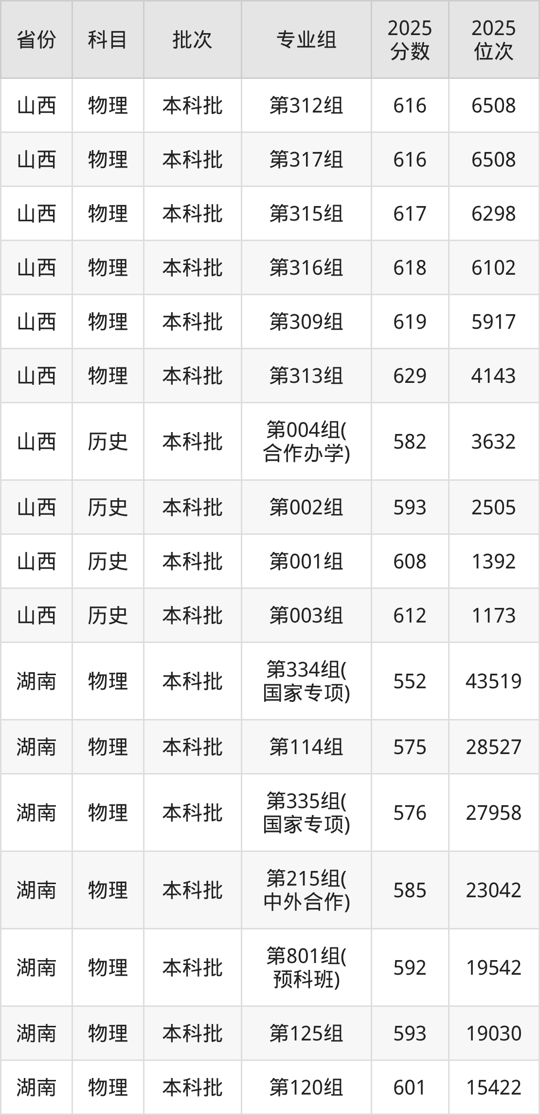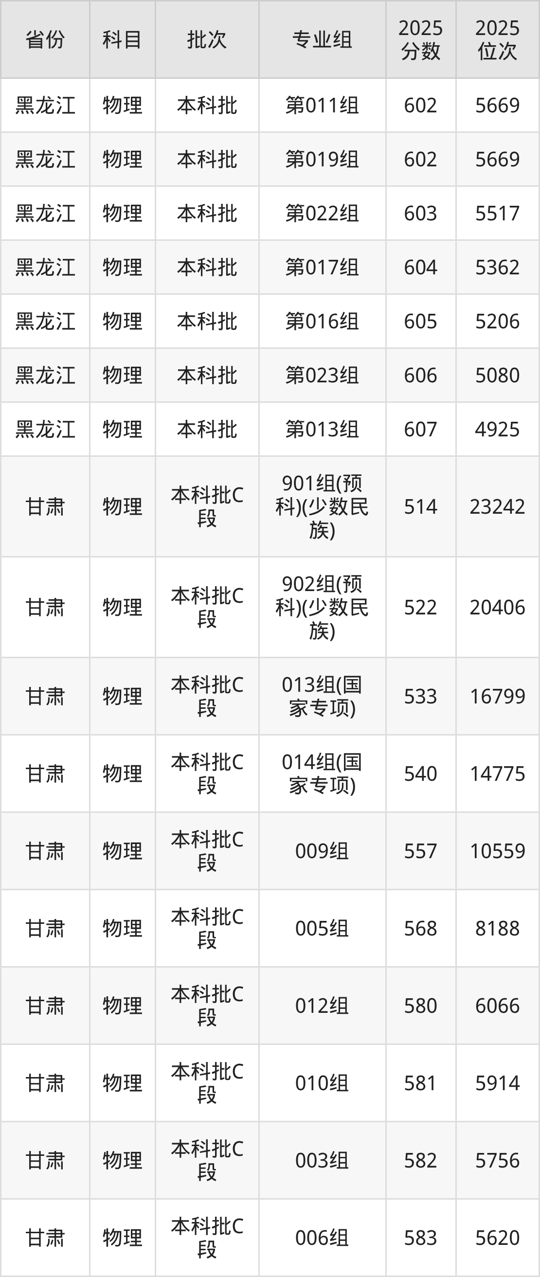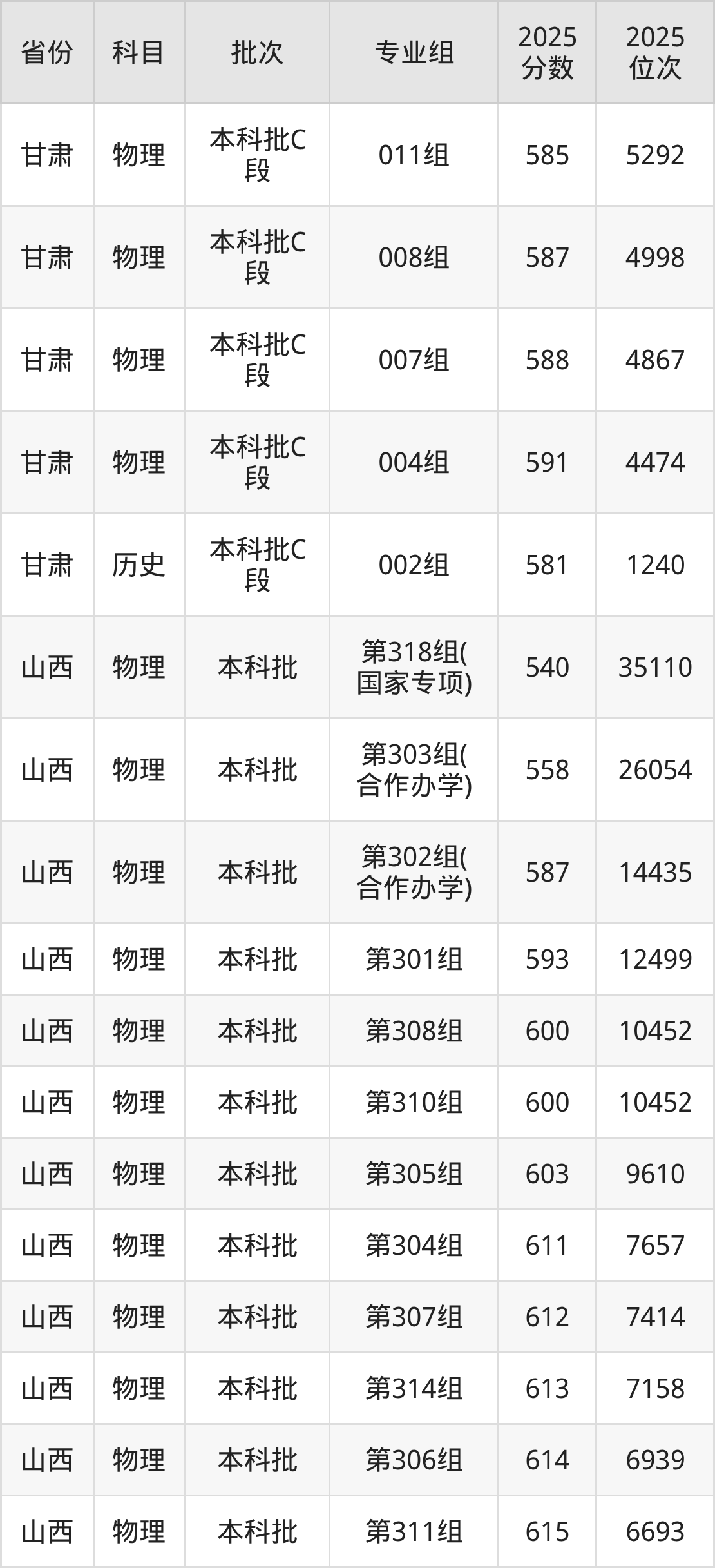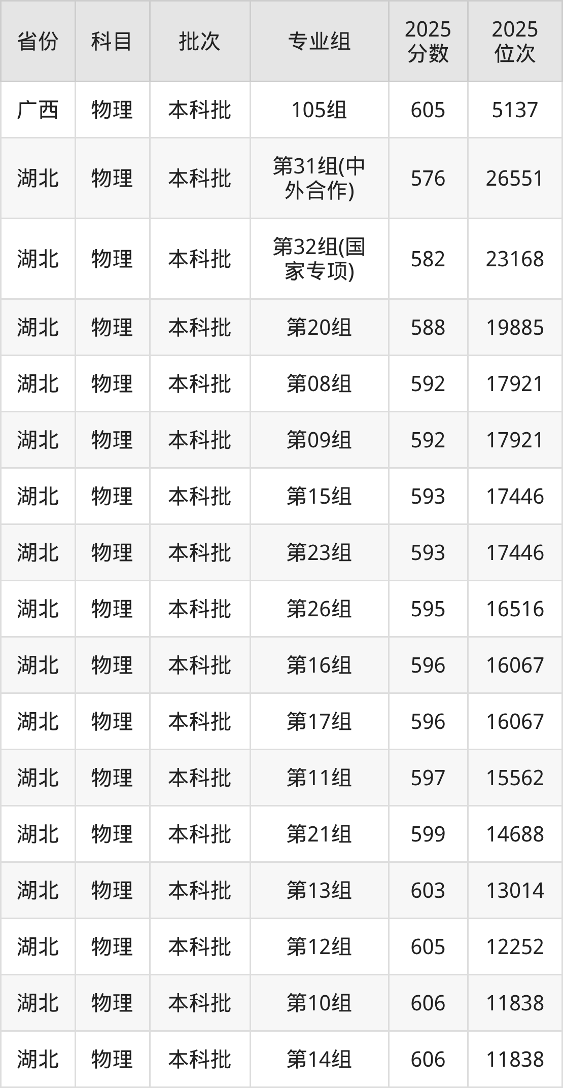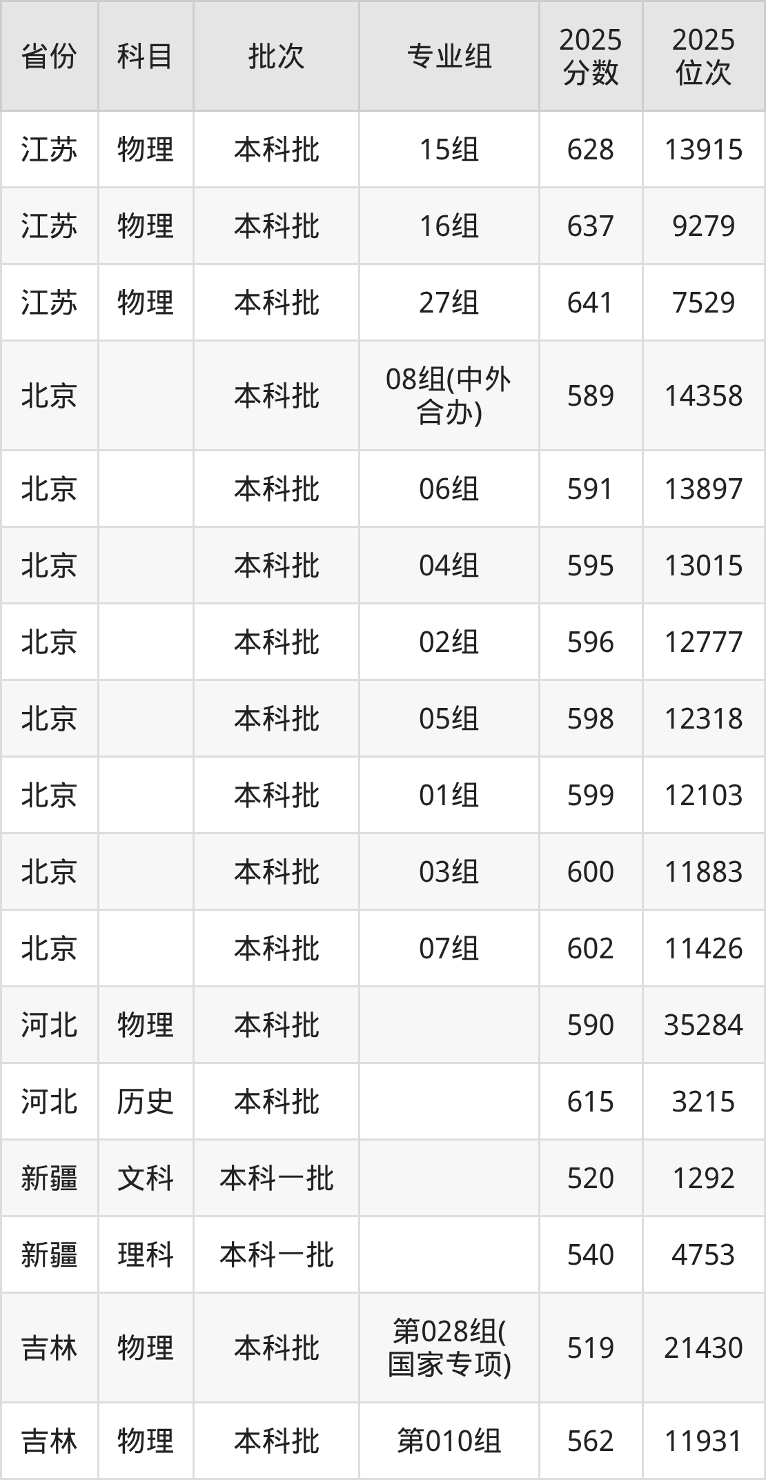 2025年在本科物理类进行招生,各专业组分数线详情如下: