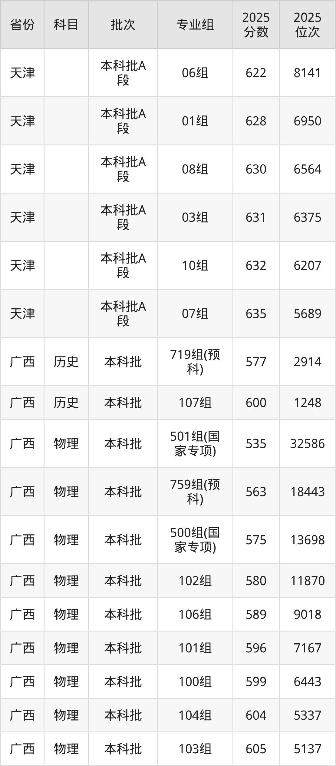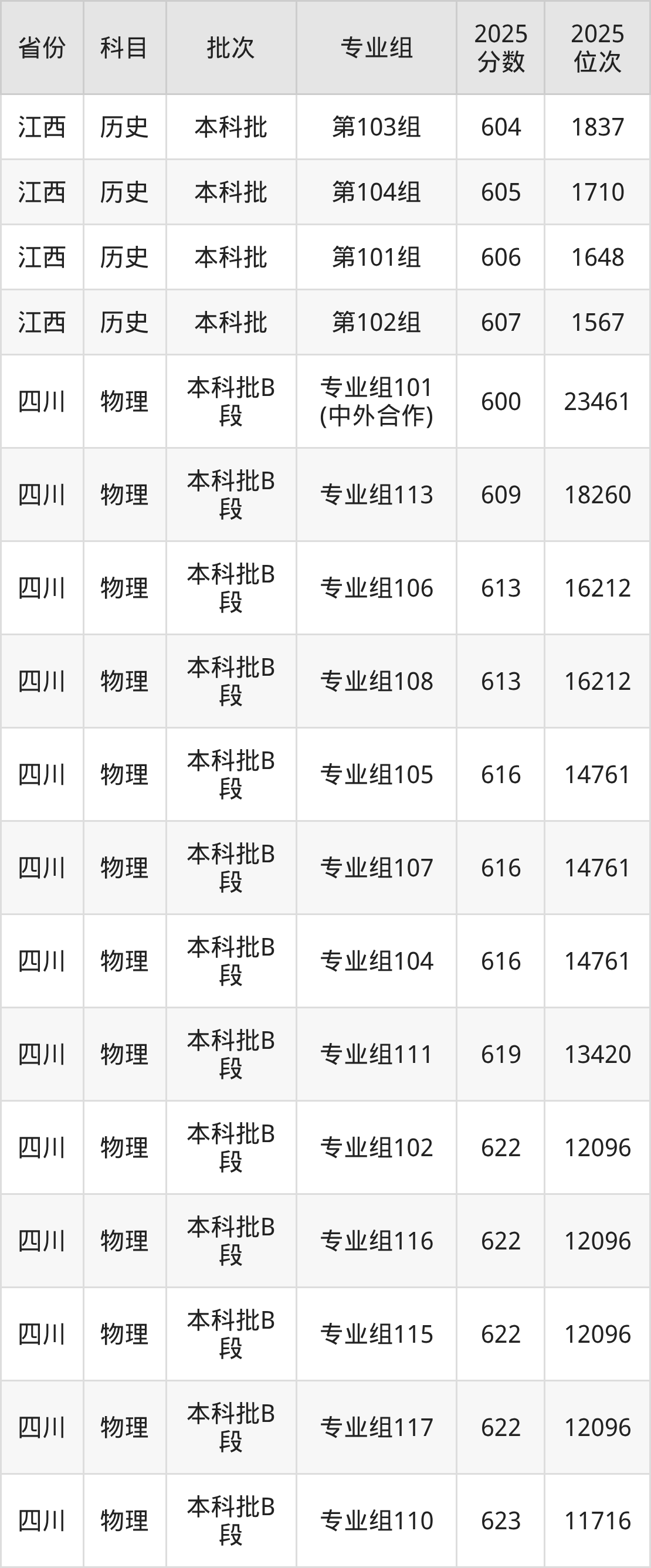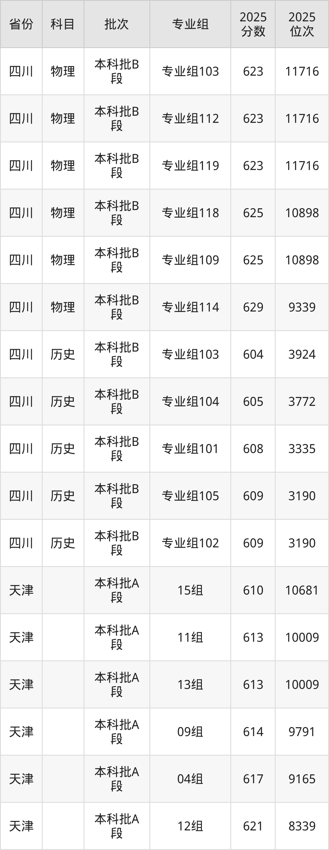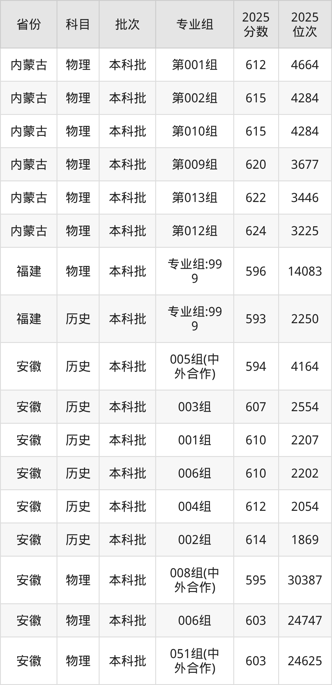 2025年在本科物理类进行招生,各专业组分数线详情如下: