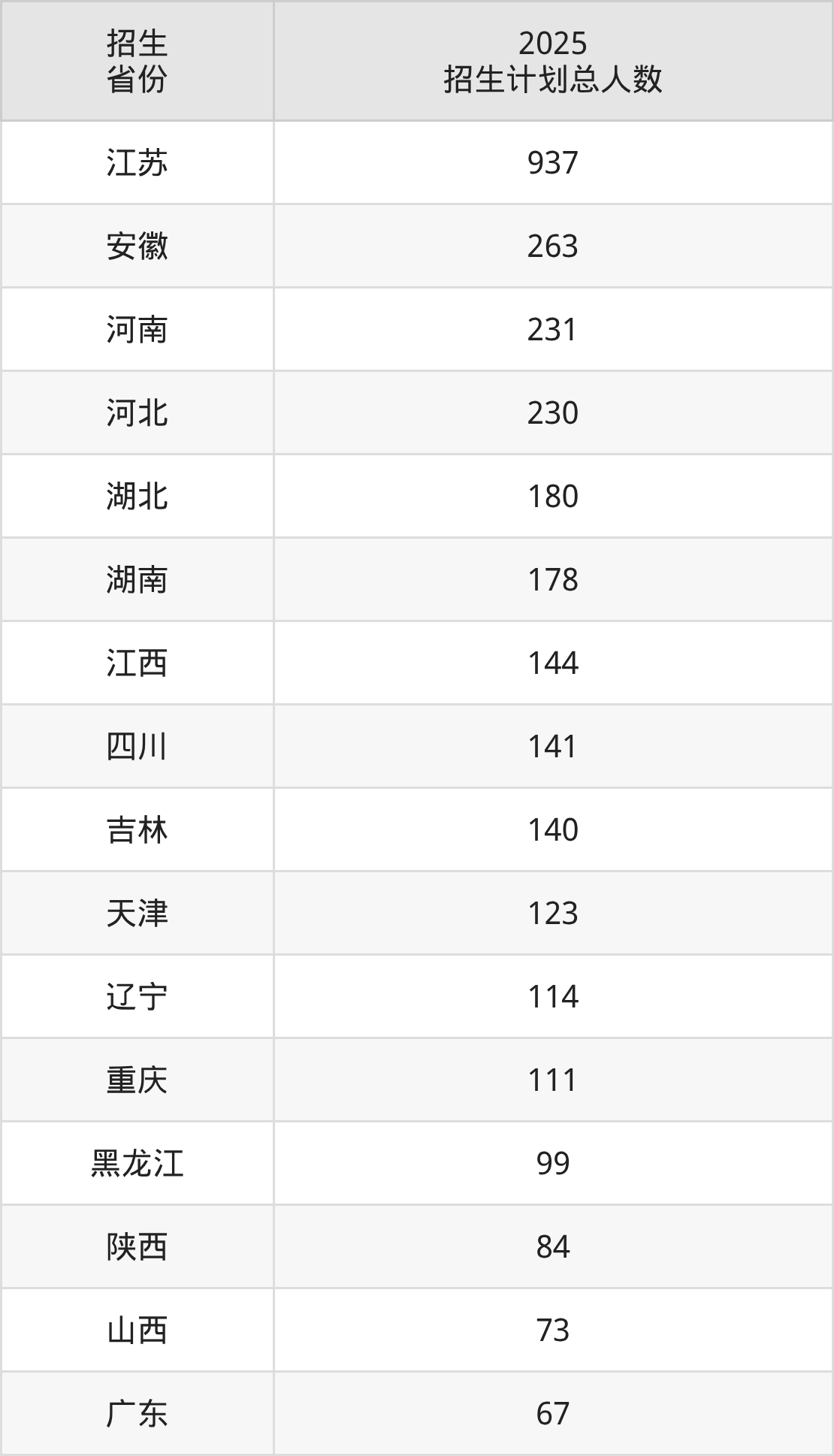 2025年江南大学面向全国28个省市开展本科招生;招生专业共52个,招生人数共3605人。2025年在江苏省招生计划总人数是937人,其中,江南大学在江苏省招生人数最多的是物联网工程。江南大学在各省具体招生人数情况如下表。
