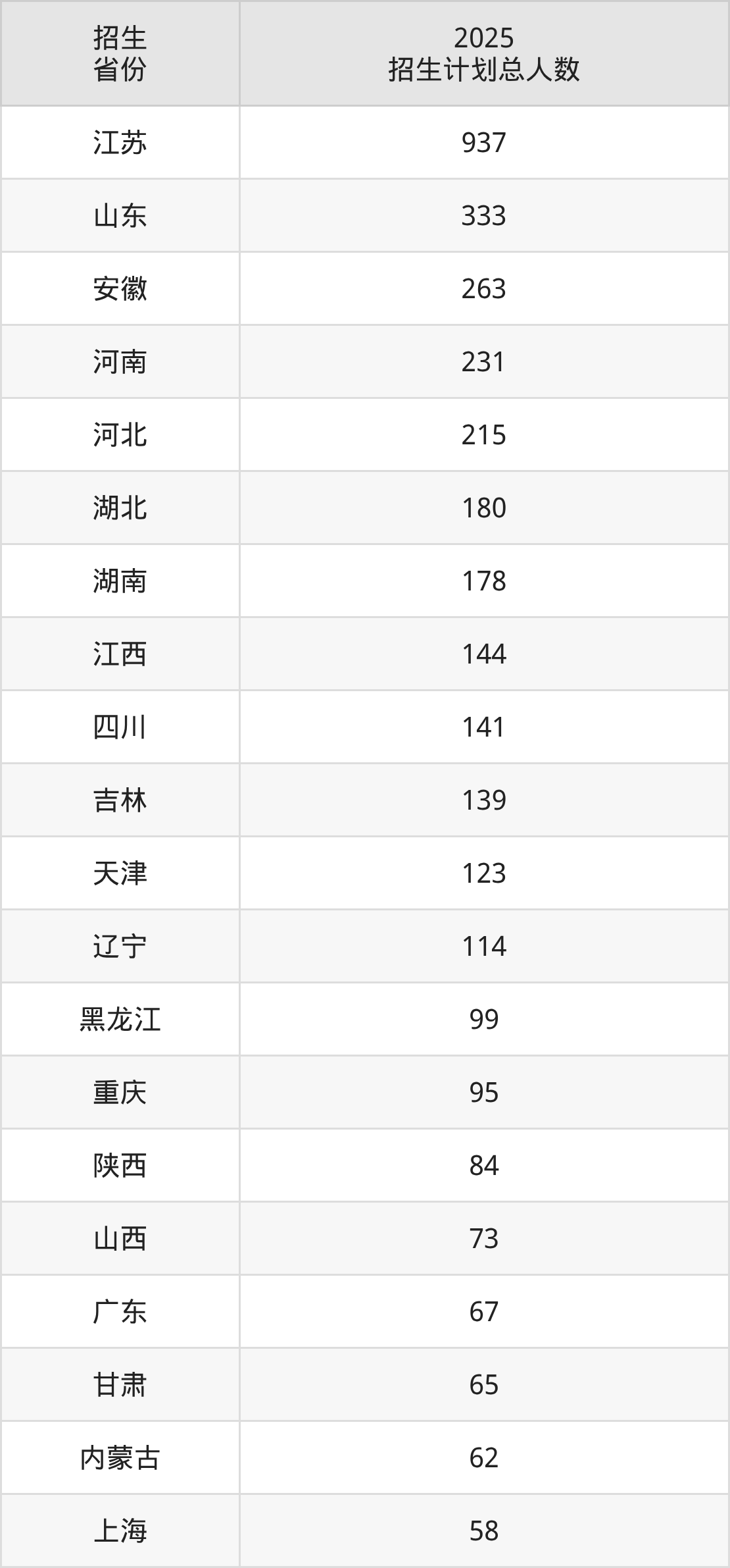 2025年江南大学面向全国29个省市开展本科招生;招生专业共52个,招生人数共3905人。2025年在江苏省招生计划总人数是937人,其中,江南大学在江苏省招生人数最多的是物联网工程。江南大学在各省具体招生人数情况如下表。