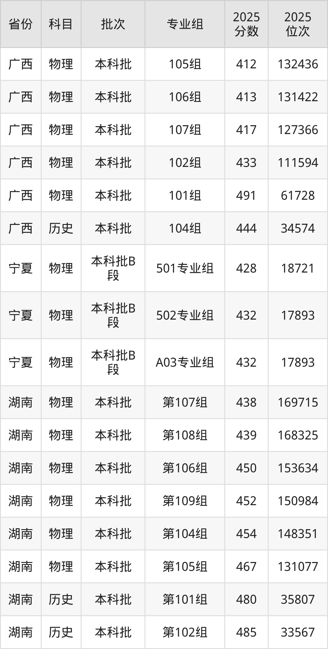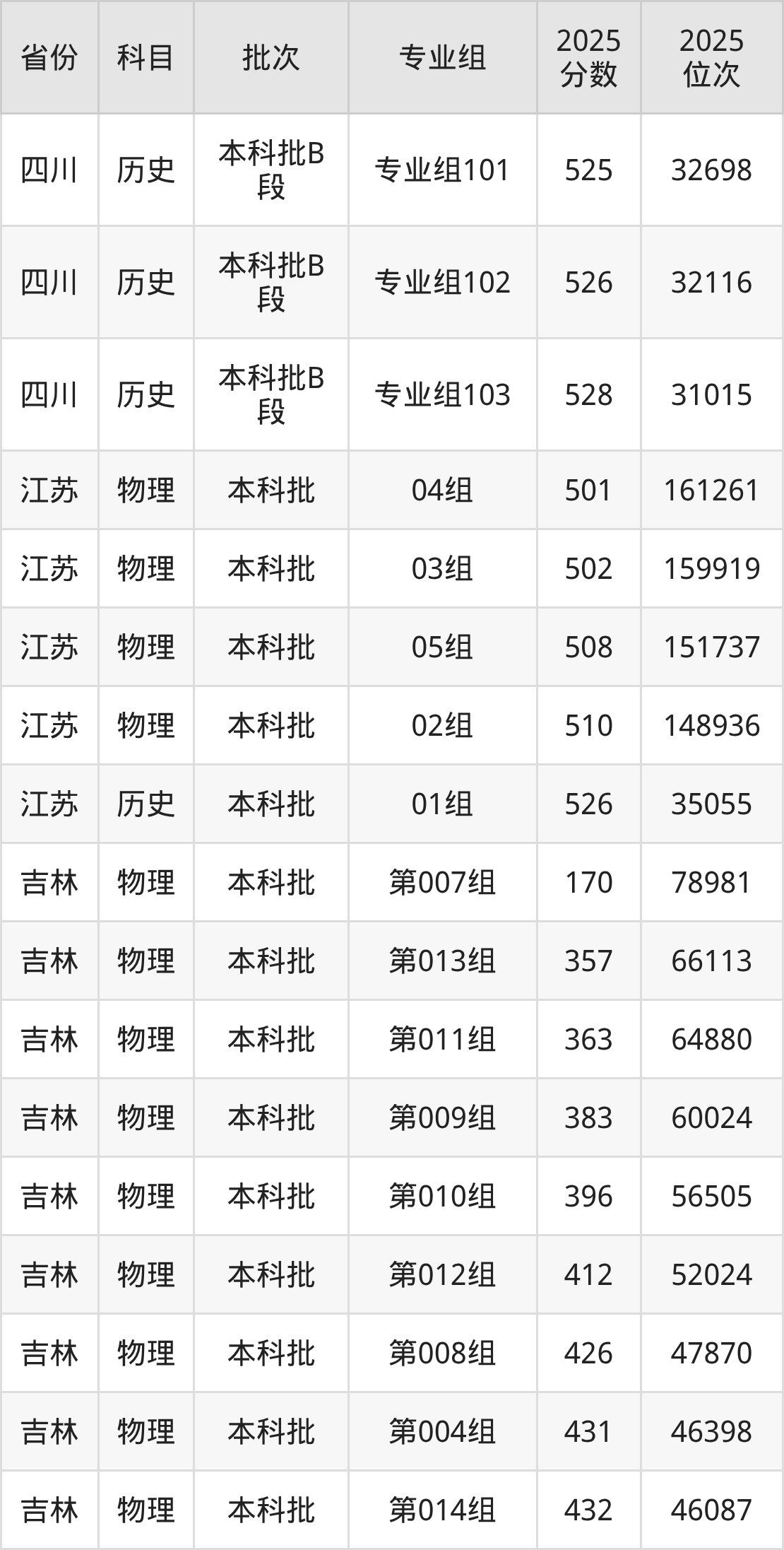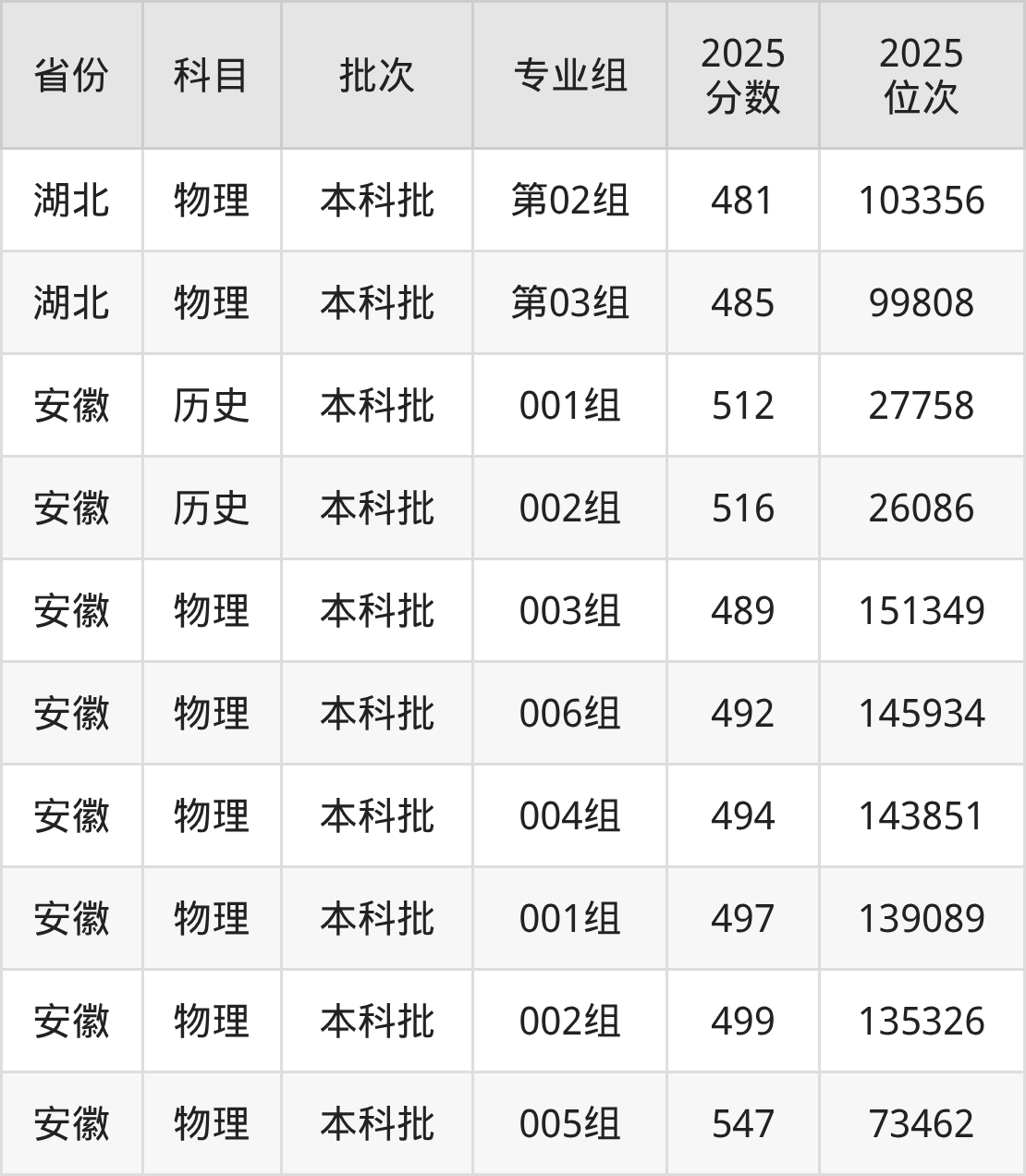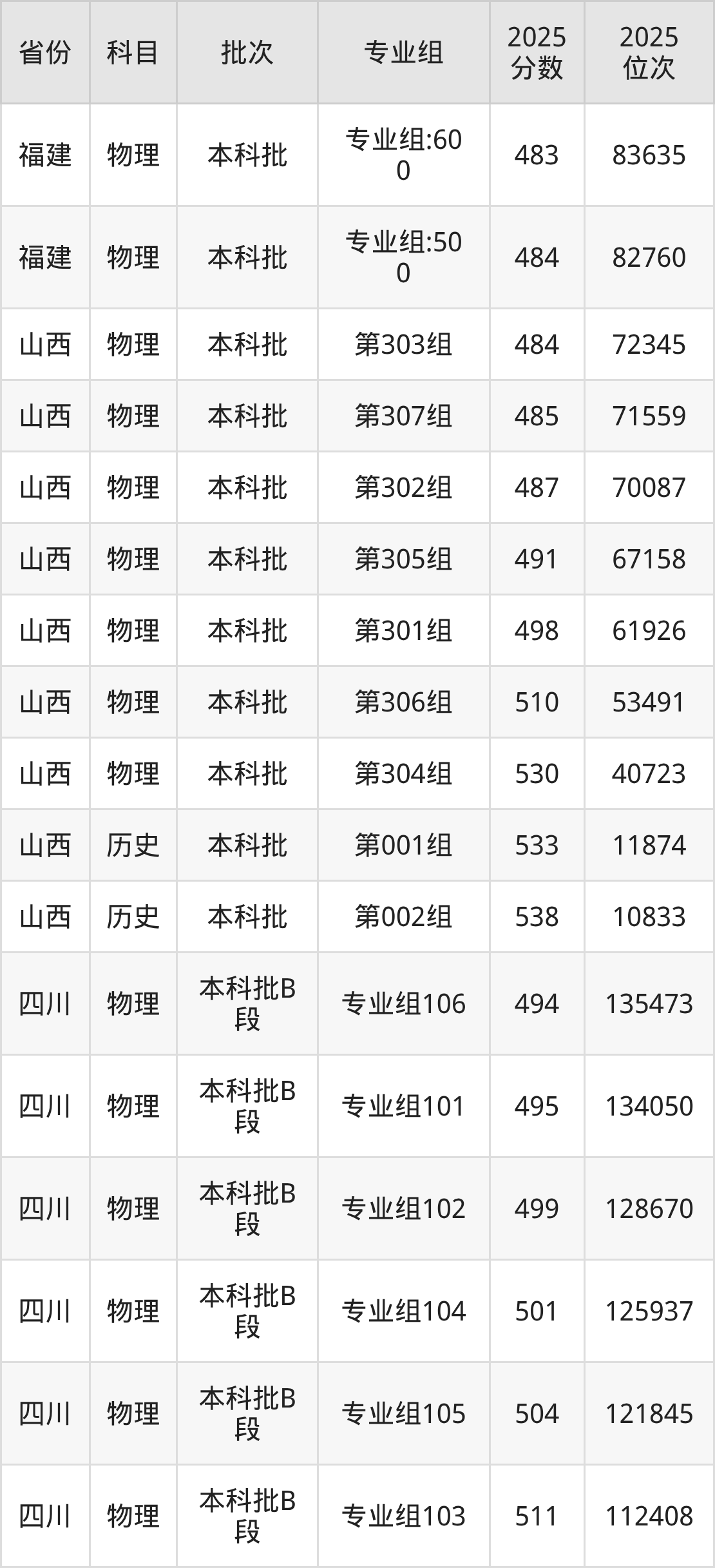 2025年在本科物理类进行招生,各专业组分数线详情如下: